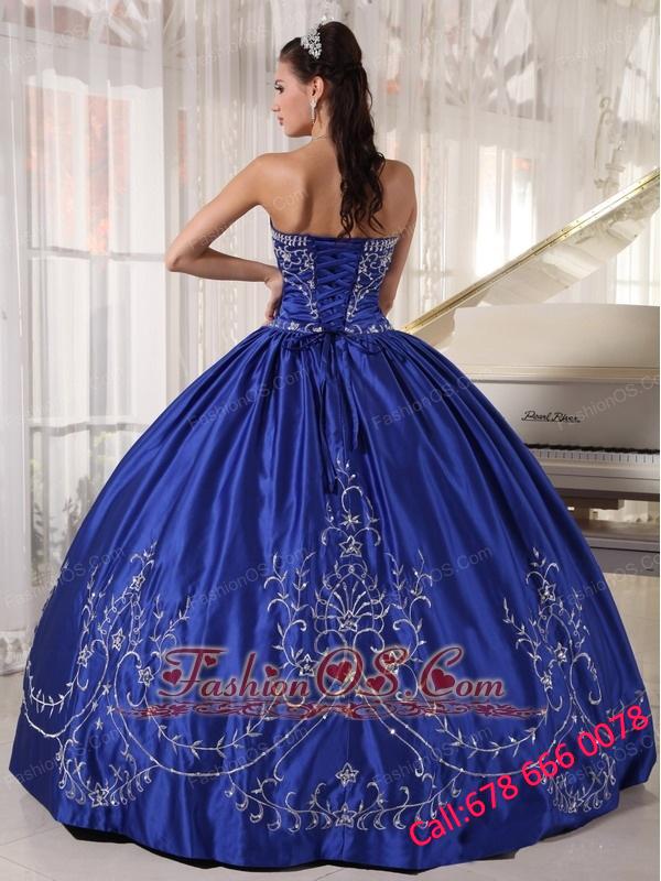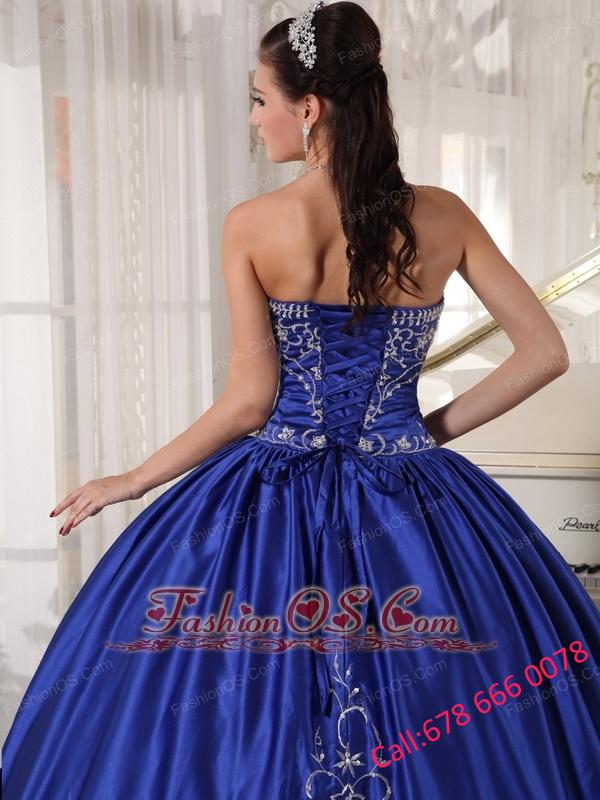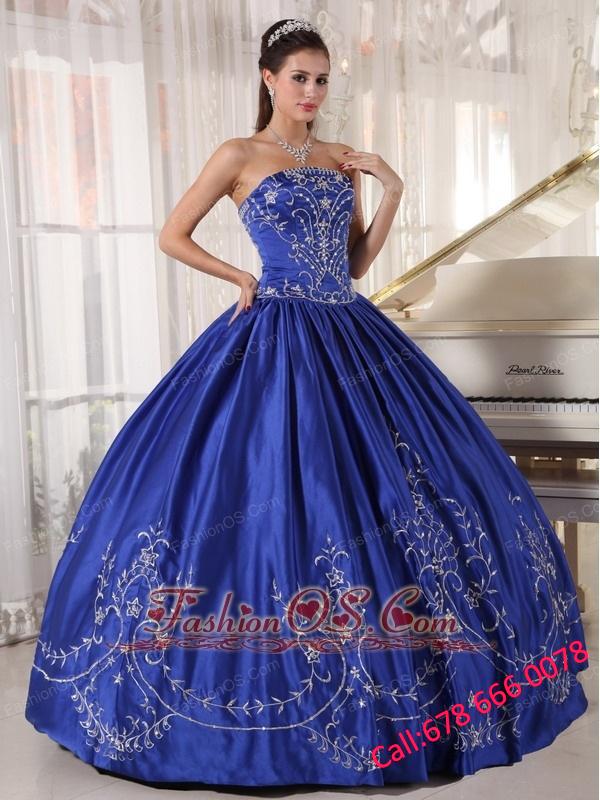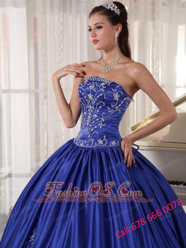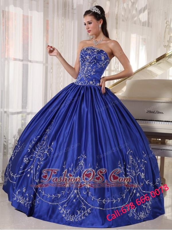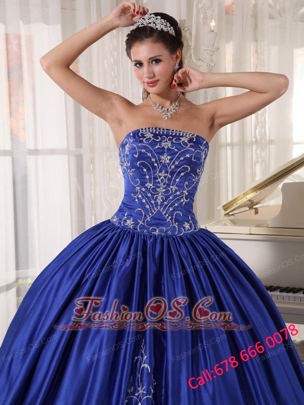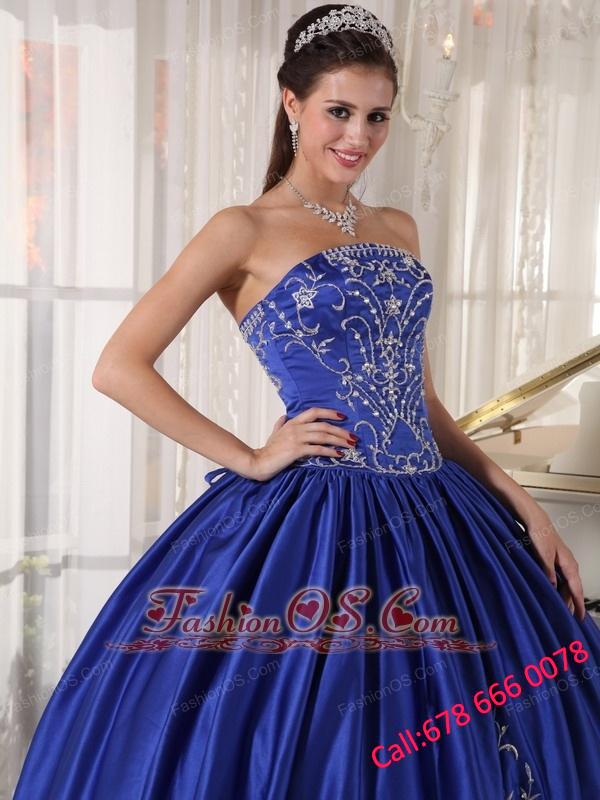 Popular Blue Quinceanera Dress Strapless Satin Embroidery Ball Gown