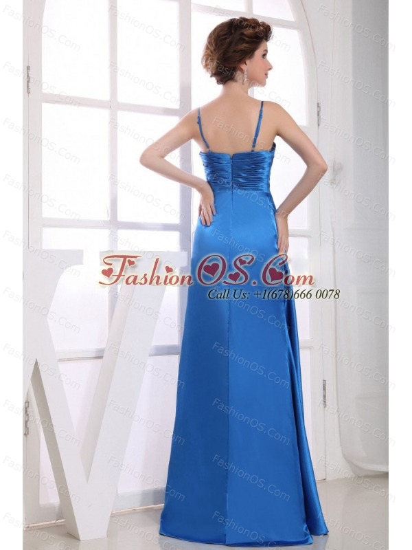 Get a look that is as strong and confident as you are in this fashionable prom dress. The sapphire blue dress features spaghetti straps and fitted bodice with ruching and sparkling beadwork. A seductive high slit lets you glide across the dance floor with ease. Soft and sleek taffeta will give your skin intimate care and look beautiful.