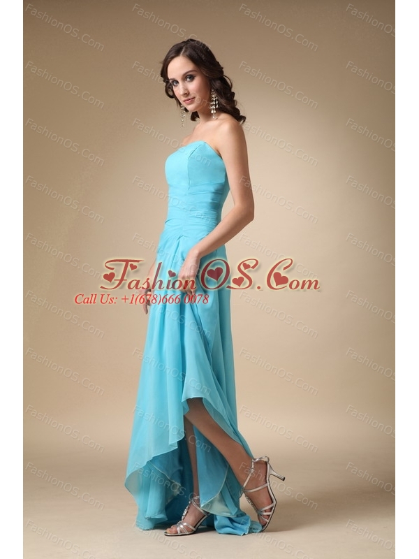The party starts the moment you arrive in this ellegant strapless prom dress. A fabulous high-low dress for prom features a strapless ruched on the side bodice. The zipper up back and the chiffon fabric give the dress a feeling of pure and fresh. If you can't decide if you want a long prom gown or short special occasion dress get the best off both worlds with this strapless dress.