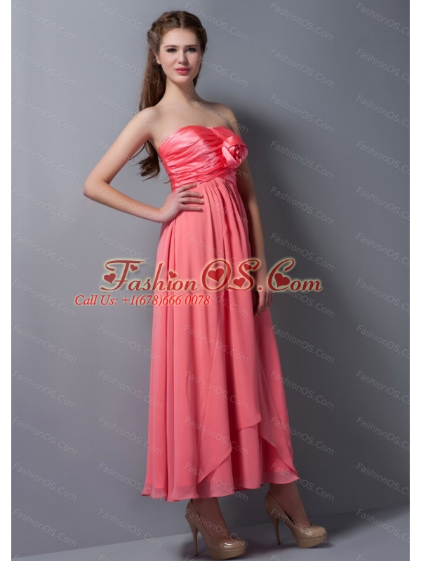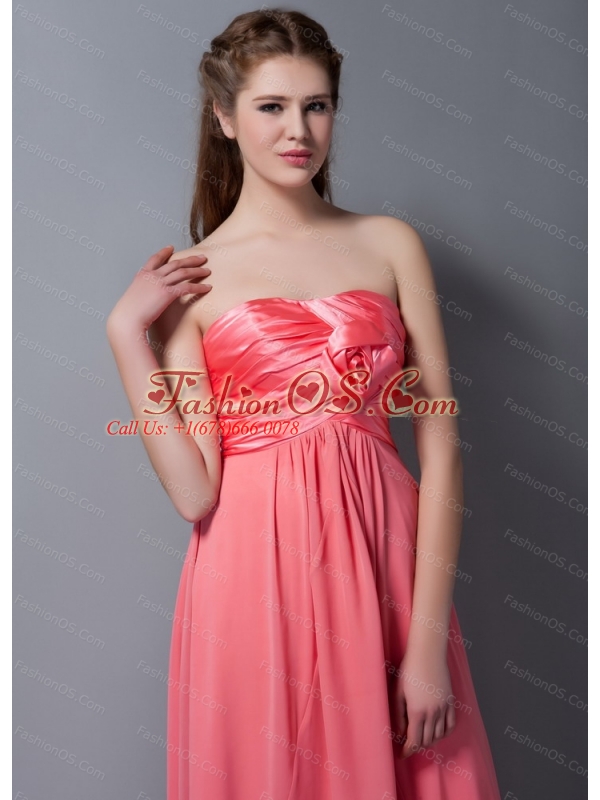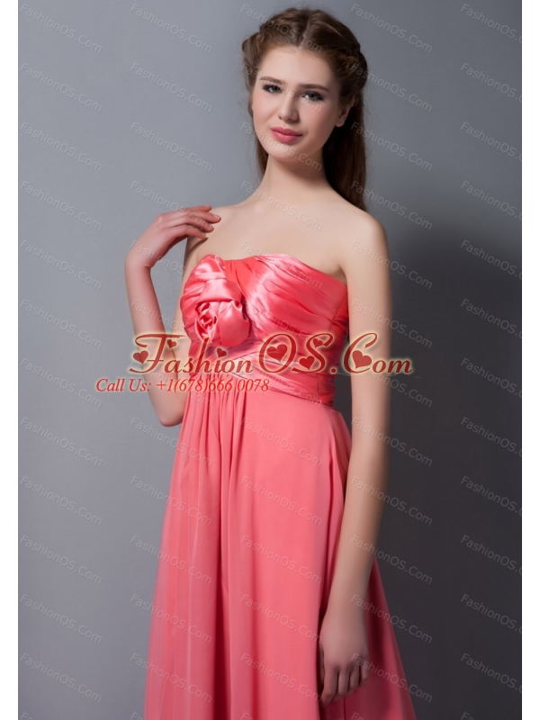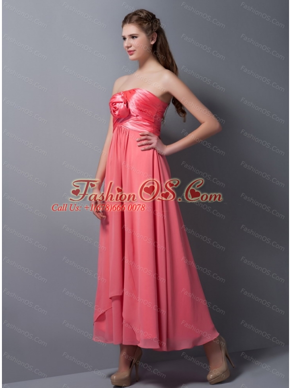 Nothing says feminine beauty like a soft and flowing gown bridesmaid.The strapless bodice is gathered in the center by floral-shaped accents on the bust. A delicate chiffon overlay covers the entire gown and leads to two layers and a slight ruffle at the bottom hem of the knee-length, a-line skirt.