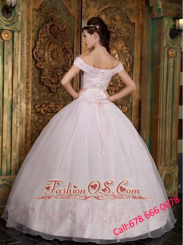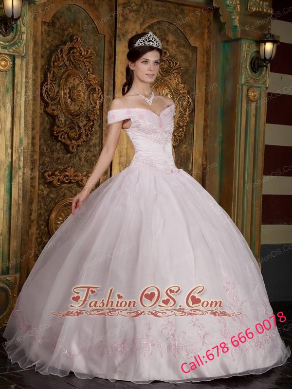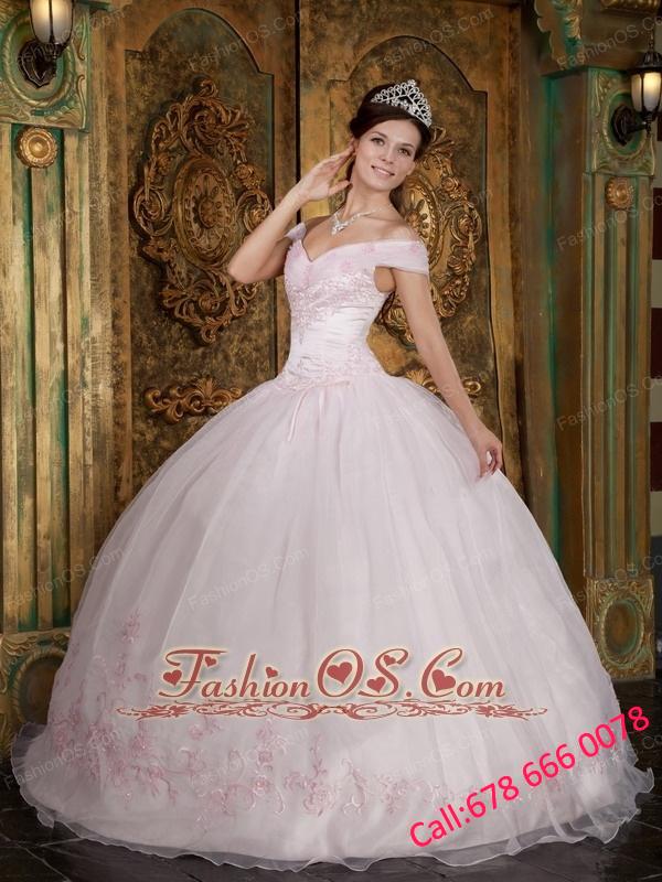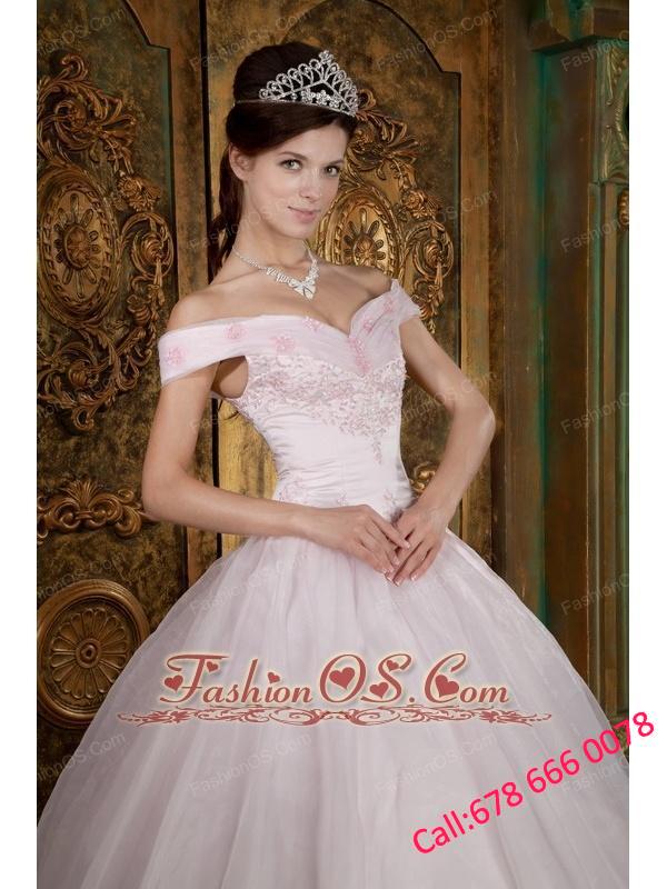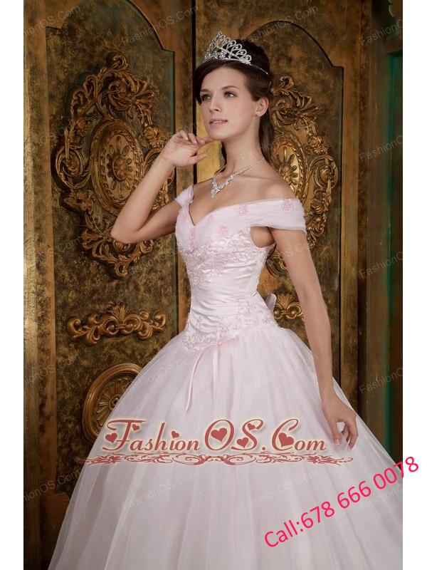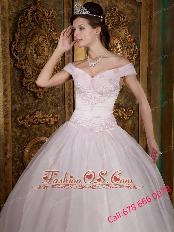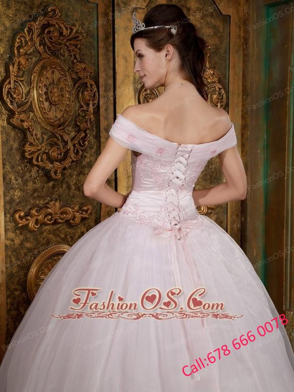 Modest Light Pink Quinceanera Dress Off The Shoulder Appliques Organza Ball Gown