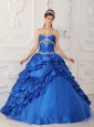 A romantic blue quinceanera gown features a sweetheat neckline and a pleated bodice sharply show your girly beauty. The appliques and sequins scattered intricately on the dress add the fine look and shinning effect.The skirt accent heavy ruffles and a out split tulle layer add the sassy and lovely of the dress. A lace up corset style closure in the back secures the dress in place. Dressing the dress makes you feel like a princess.