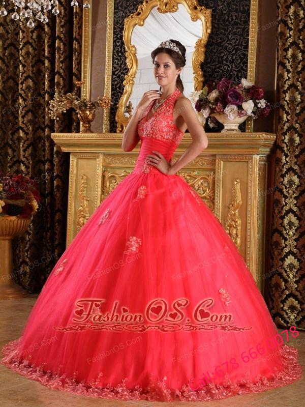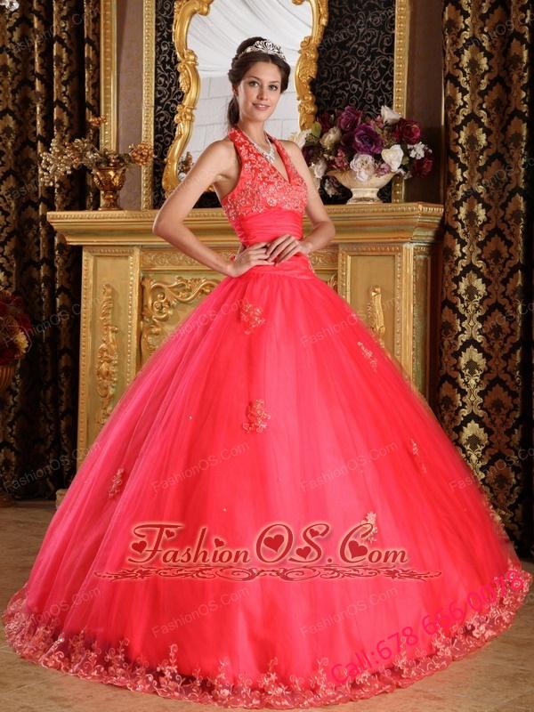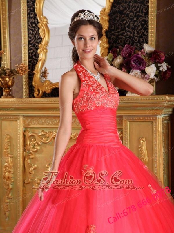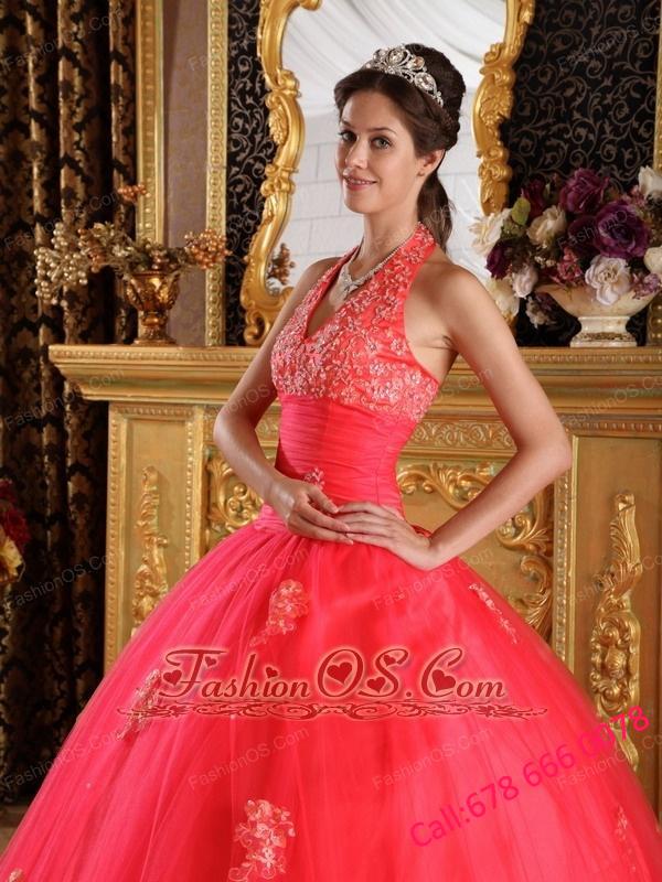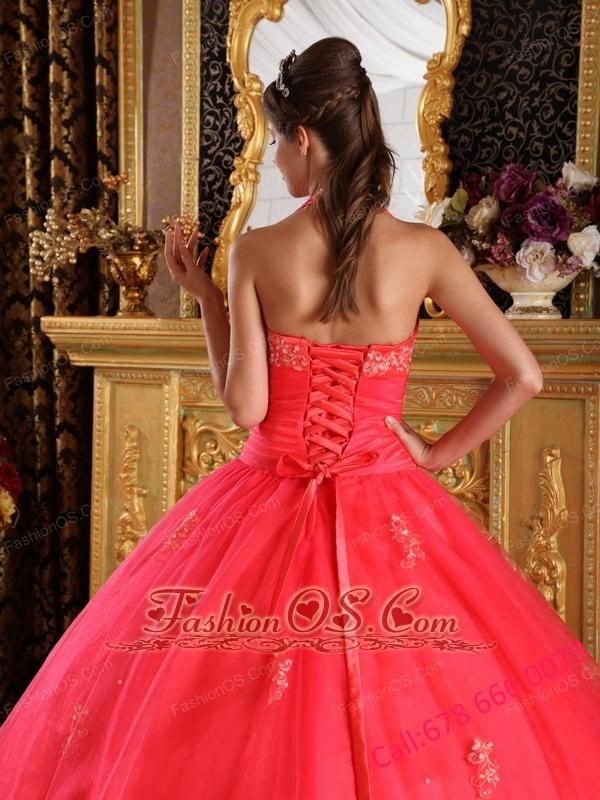 Gorgeous Coral Red Quinceanera Dress Halter Appliques Tulle Ball Gown