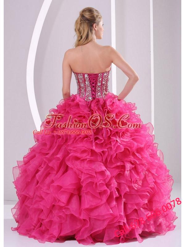 Hot Pink Ball Gown Sweetheart Ruffles and Beading Long Organza Quinceanera Dresses 2014