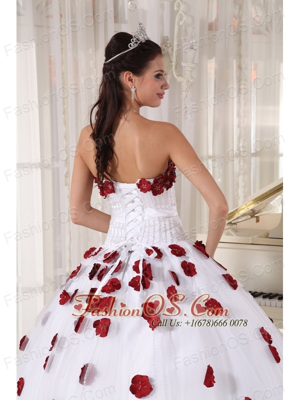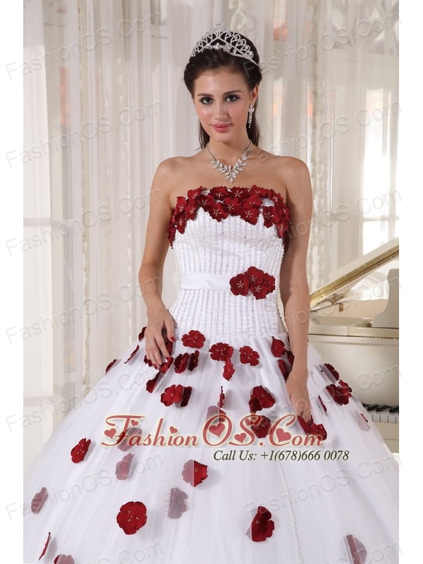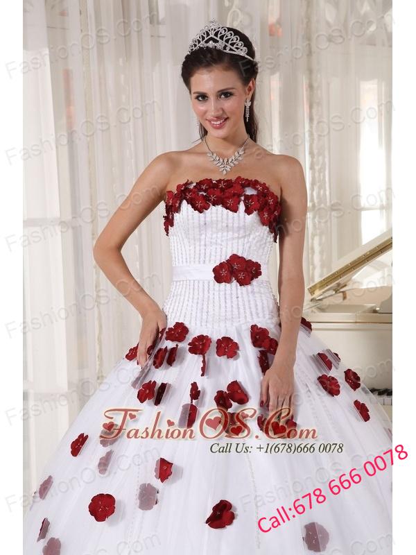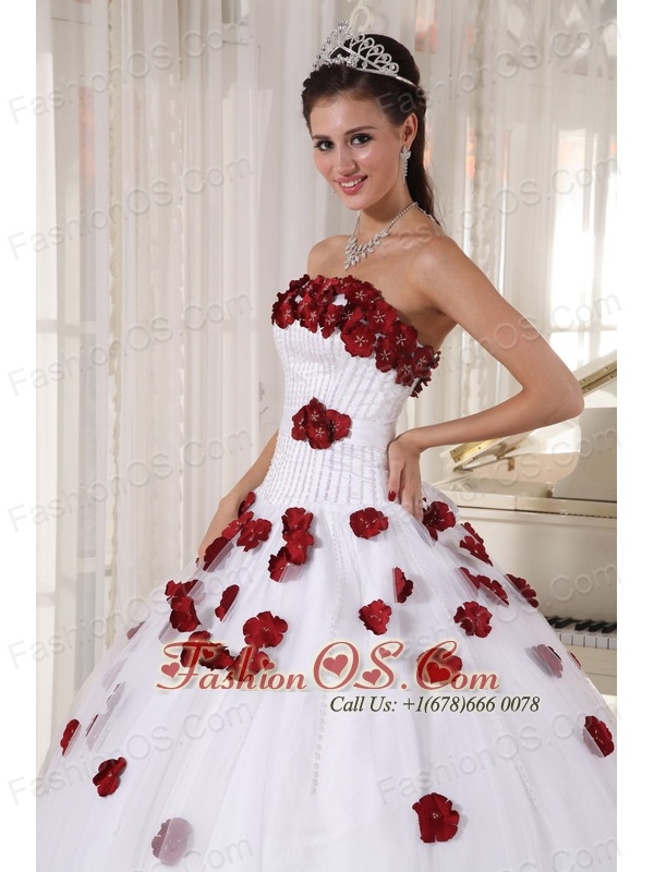 Formal White and Wine Red Quinceanera Dress Strapless Tulle Beading and Hand Made Flowers Ball Gown