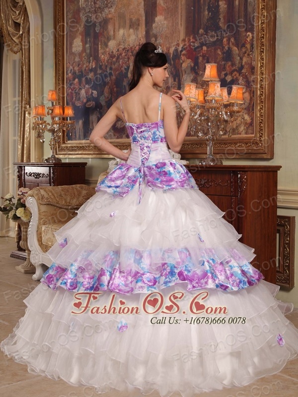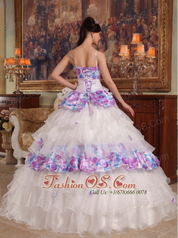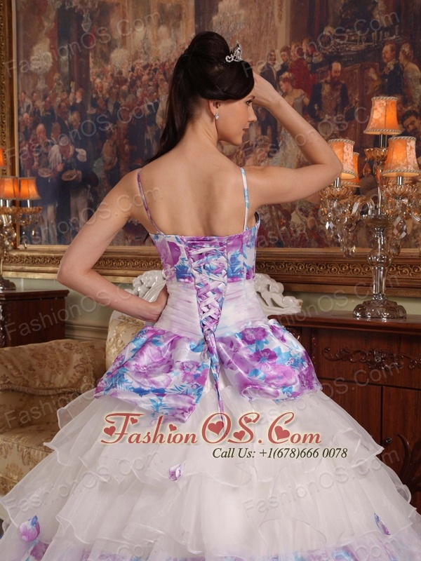 This quinceanera dress is gorgeous! Opulence is the word written all over this dress. It features a spaghetti Straps bodice with a classic floral printed fabric. A white organza sash with a conspicuous flower on the waist adds interest and detail to the mid-section of the dress. The full skirt is dazzling with series of ruffles that begins at the waistline and envelopes the legs in luxurious tulle in a pretty cake-like shape.A floral printed lace up completes the back.