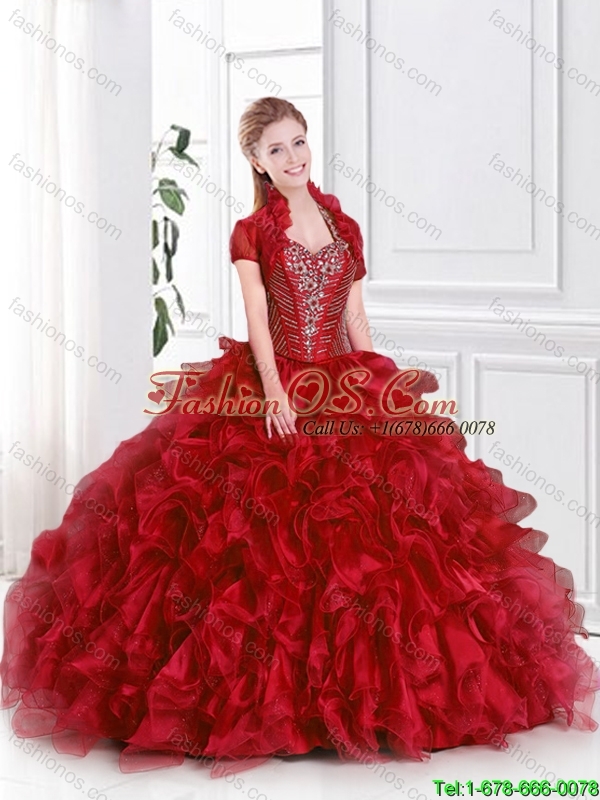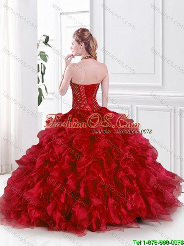 2016 Hot Sale Halter Top Wine Red Sweet 16 Gowns with Ruffles