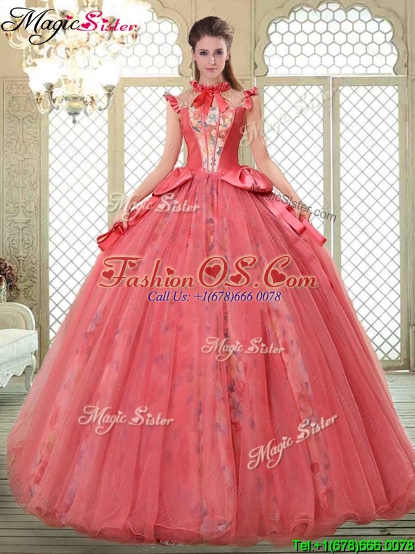 Classical High Neck Cap Sleeves Quinceanera Gowns with Bowknot
