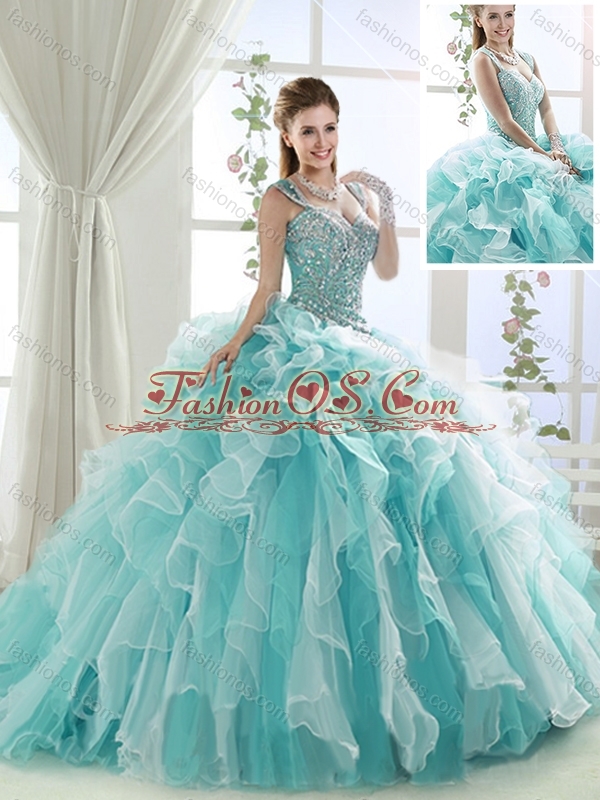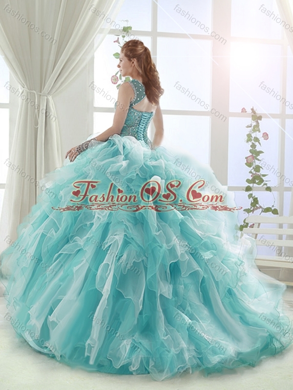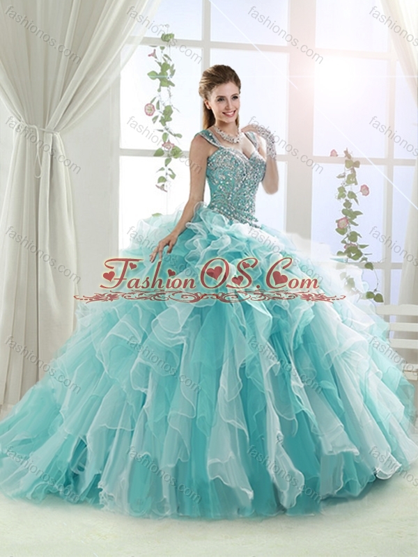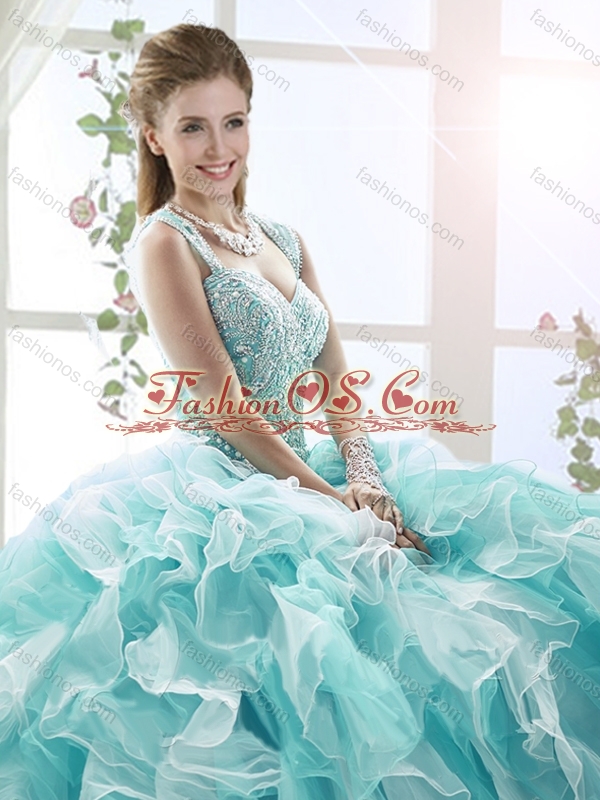 Exclusive Beaded and Ruffled Straps Quinceanera Dress in White and Aqua Blue