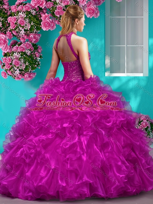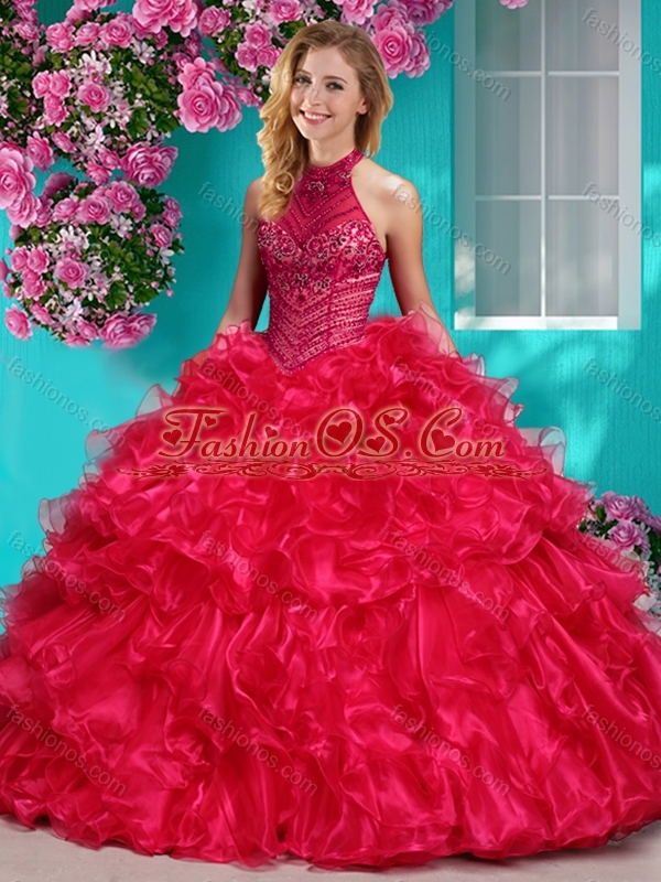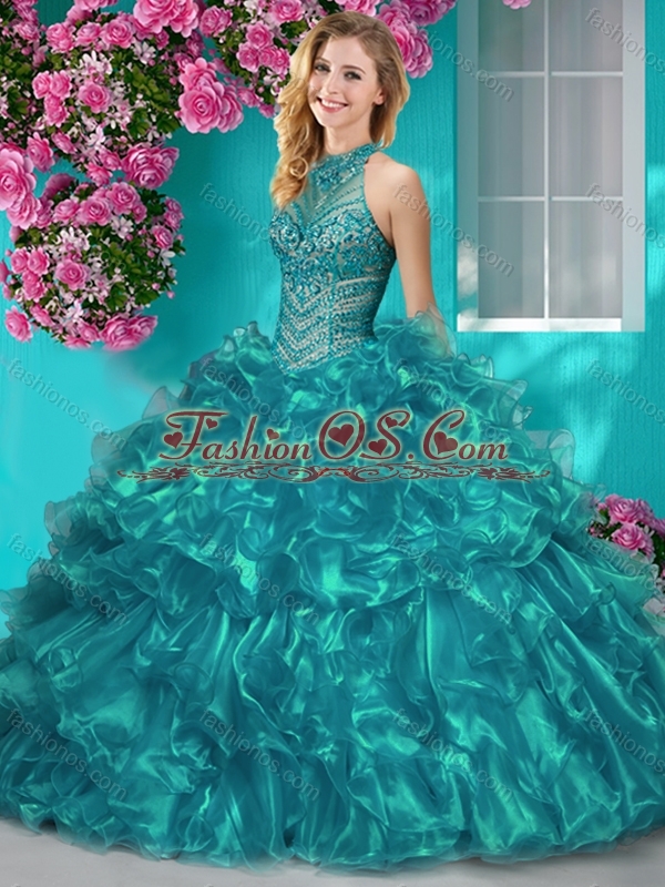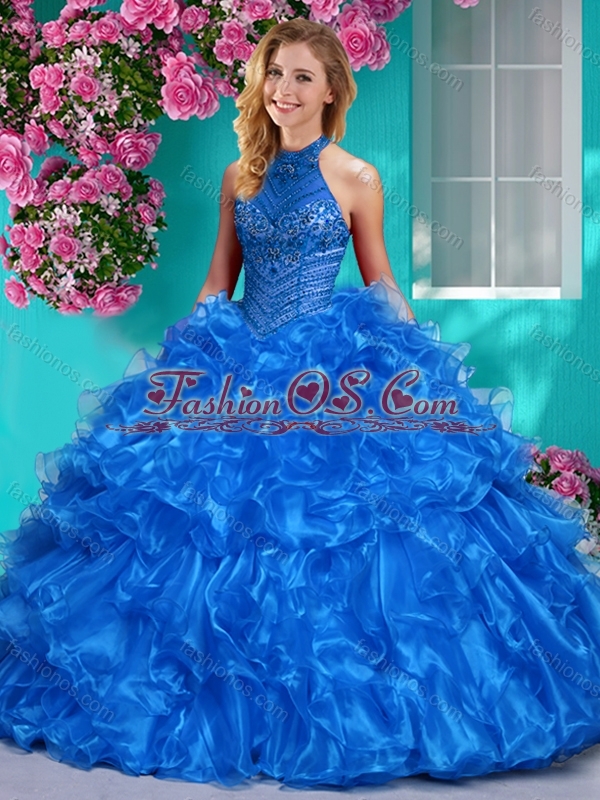 Beautiful Halter Top Beaded and Ruffled Quinceanera Dress in Royal Blue