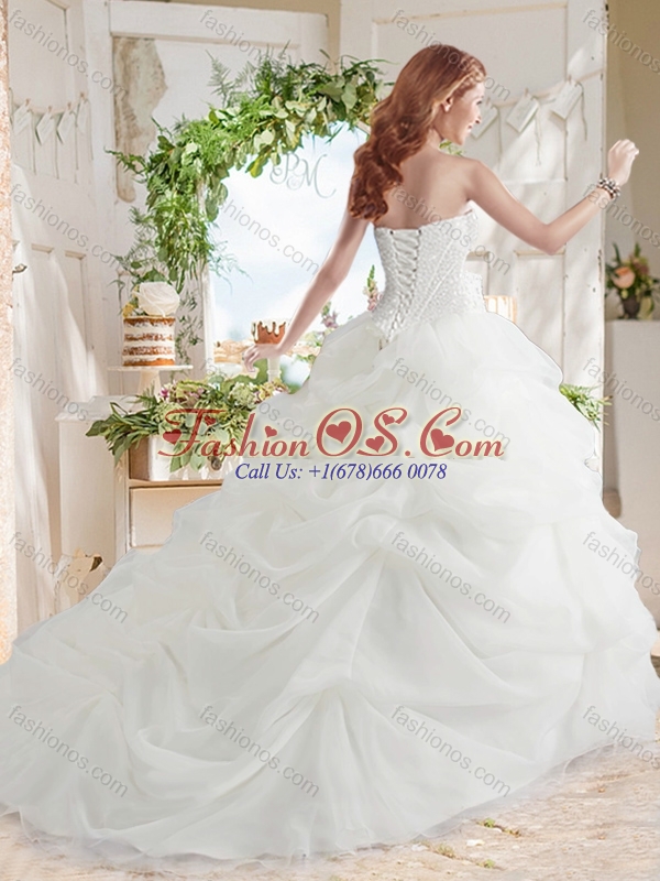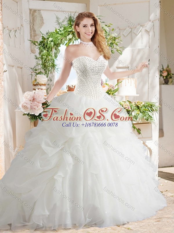 White Ball Gown Sweetheart Organza Court Train Beaded and Bubbles Quinceanera Dress