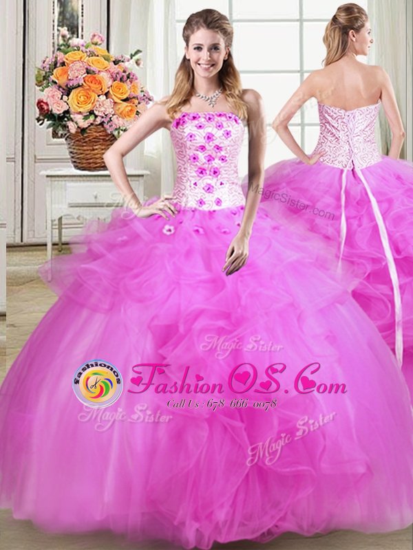 Dramatic Three Piece Mermaid Strapless Sleeveless Tulle Ball Gown Prom Dress Beading and Appliques and Ruffles Lace Up