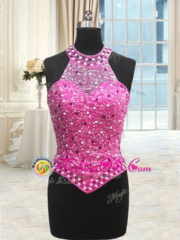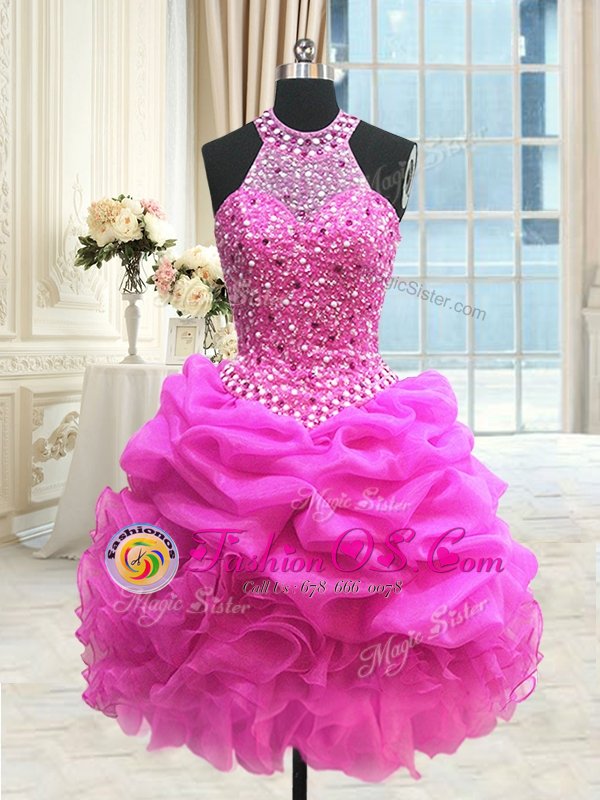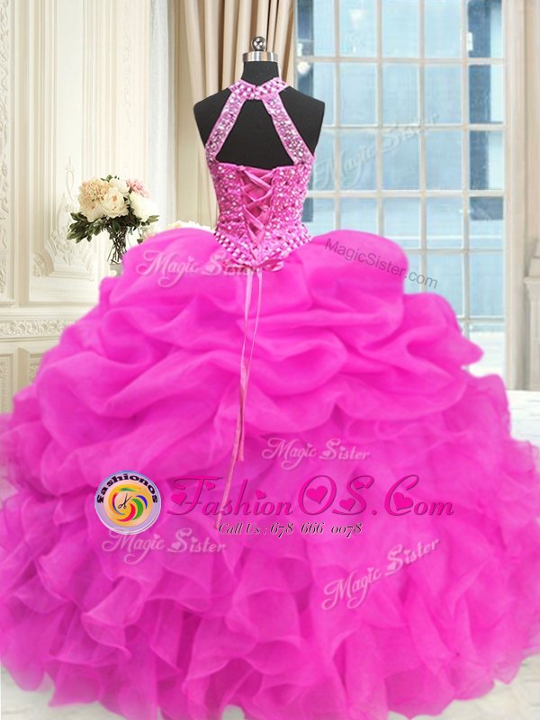 Adorable Three Piece Hot Pink Organza Lace Up High-neck Sleeveless Floor Length Sweet 16 Dresses Beading and Pick Ups