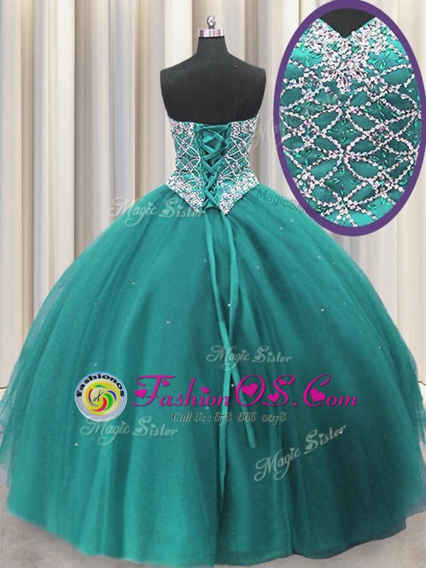 Three Piece Teal Sleeveless Floor Length Beading and Sequins Lace Up Sweet 16 Dresses