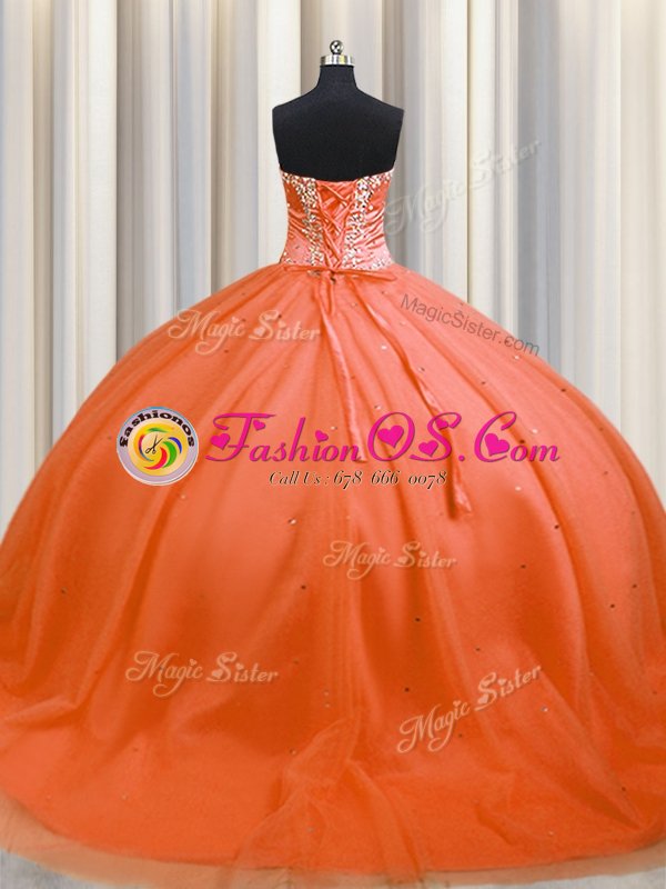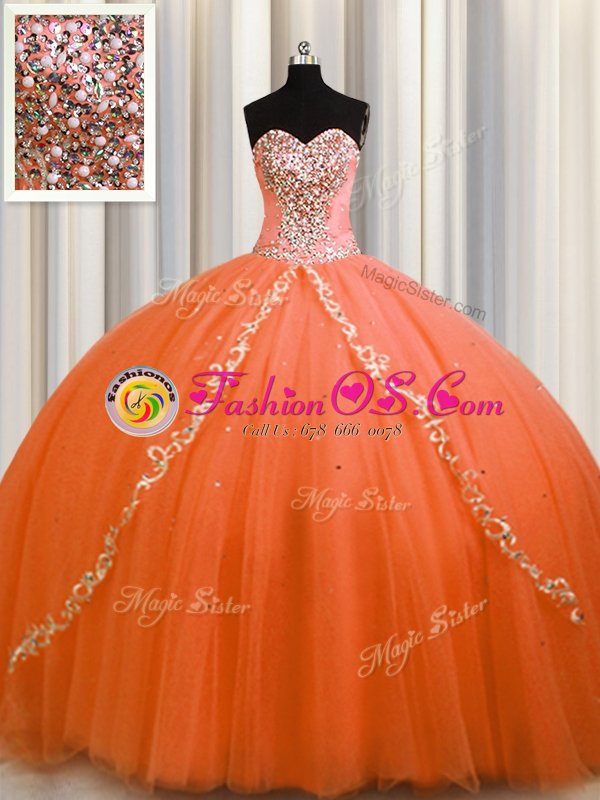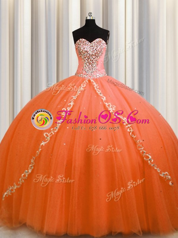 Orange Tulle Lace Up Quinceanera Gowns Sleeveless Brush Train Beading