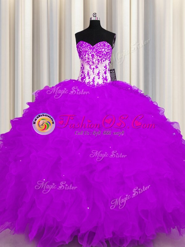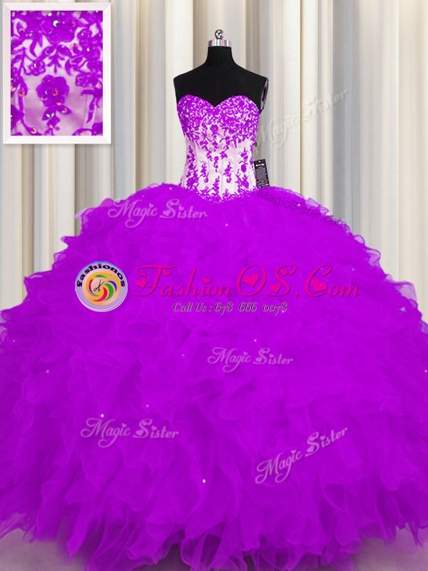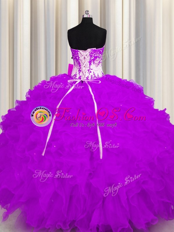 Smart Purple Ball Gowns Organza Sweetheart Sleeveless Appliques and Ruffles Floor Length Lace Up Quinceanera Dresses