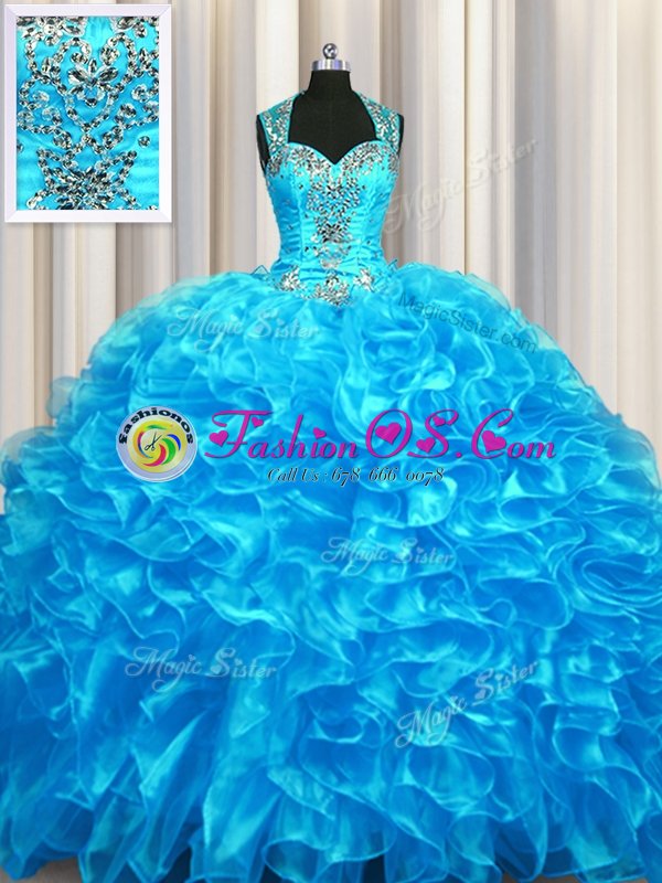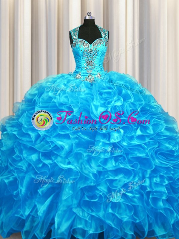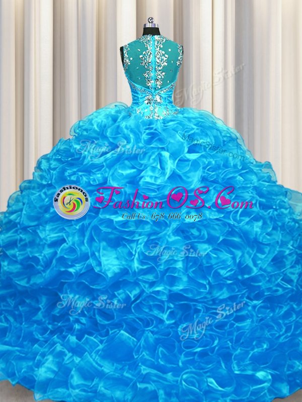 Zipper Up See Through Back Straps Sleeveless Zipper Quinceanera Gowns Baby Blue Organza
