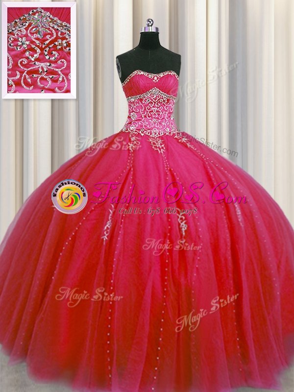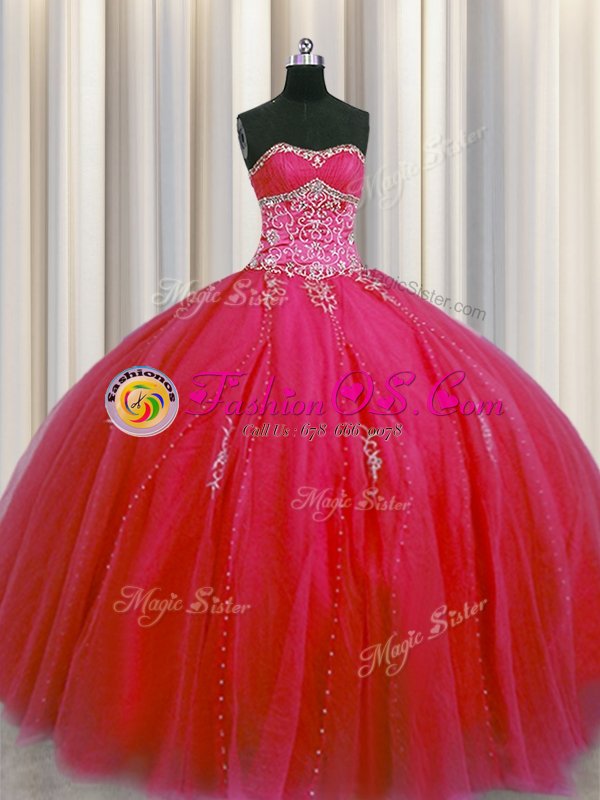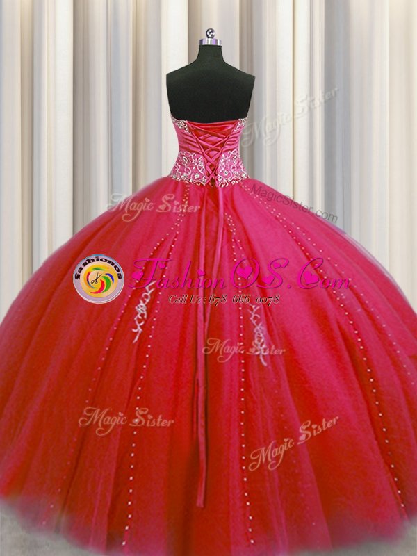 Best Big Puffy Red Sleeveless Floor Length Beading and Appliques Lace Up Quinceanera Gown