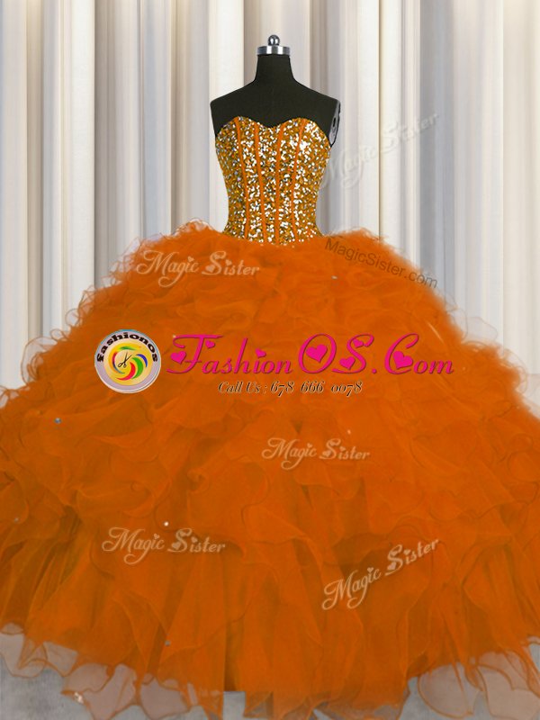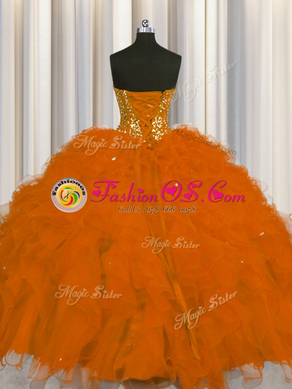 High End Visible Boning Rust Red Ball Gowns Sweetheart Sleeveless Tulle Floor Length Lace Up Beading and Ruffles and Sequins Quinceanera Dress