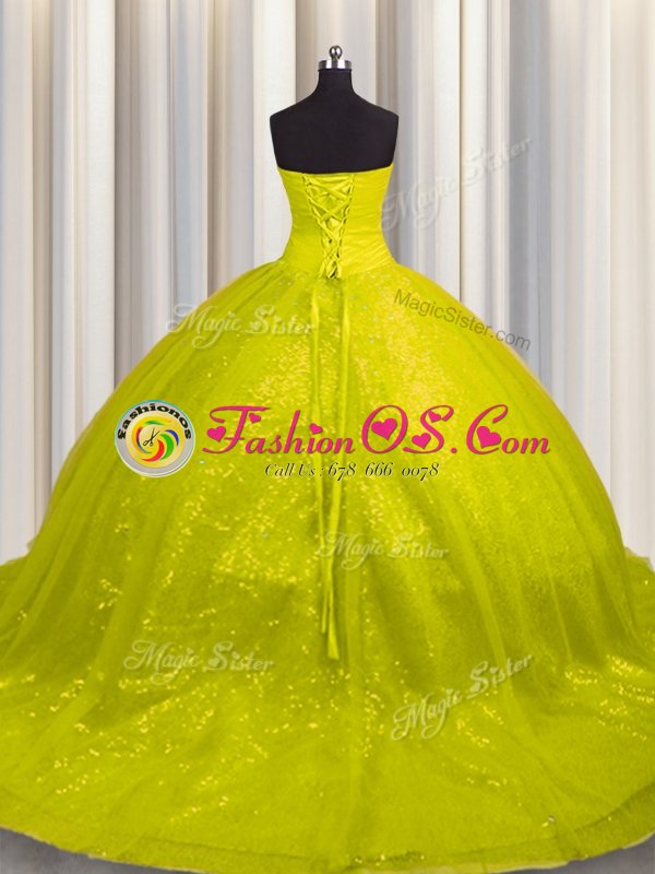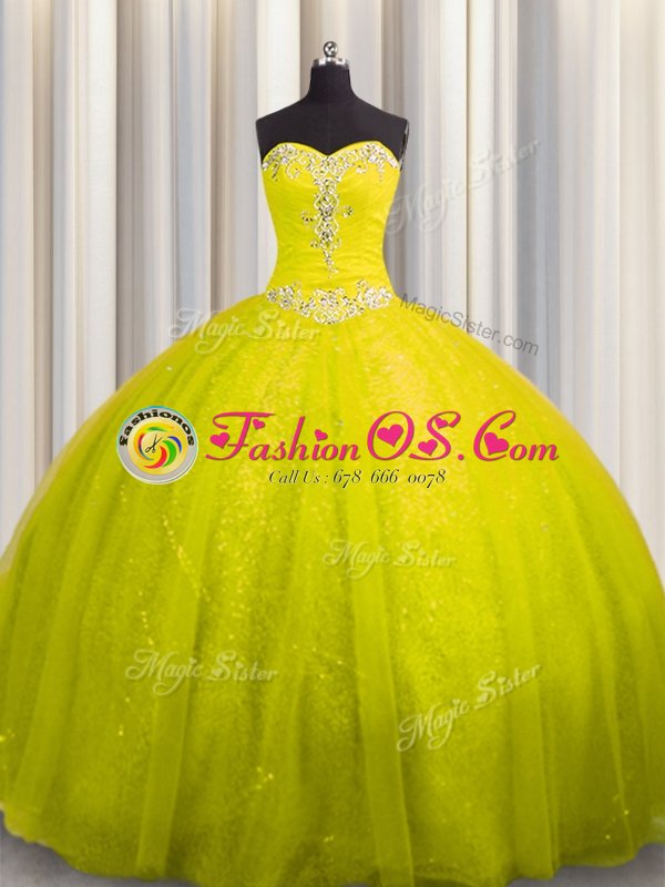 Sweetheart Sleeveless Quinceanera Gown Court Train Beading and Appliques Yellow Tulle and Sequined