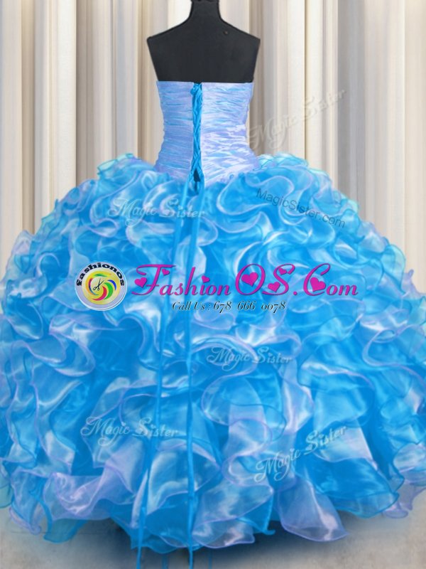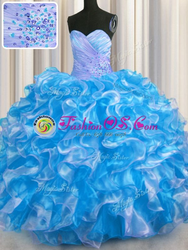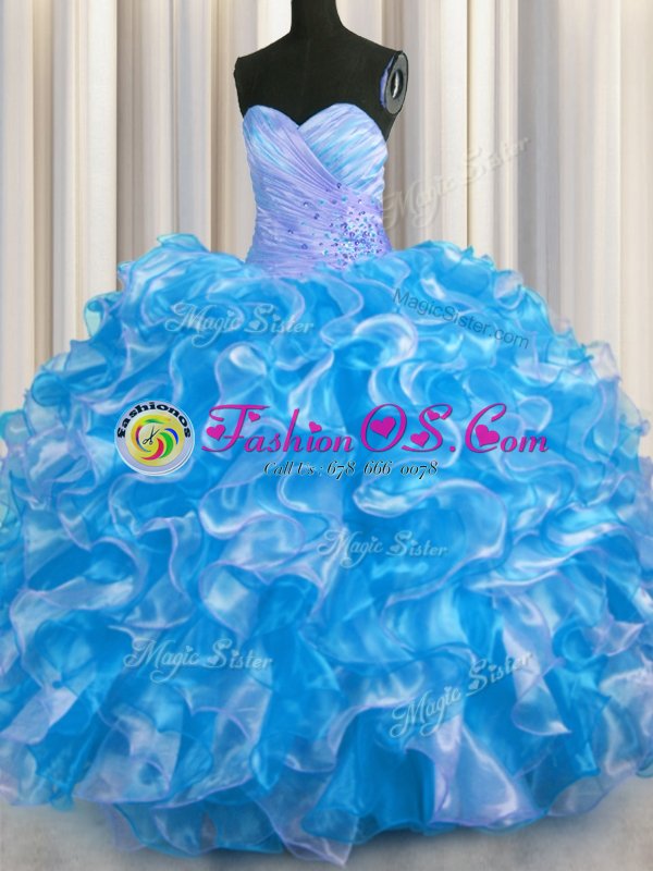 Blue And White Sleeveless Floor Length Beading and Ruffles Lace Up Quinceanera Dress