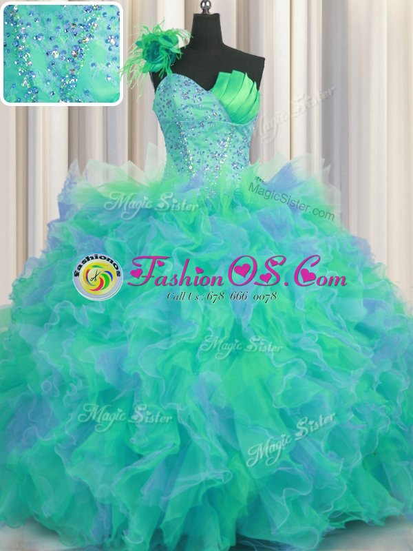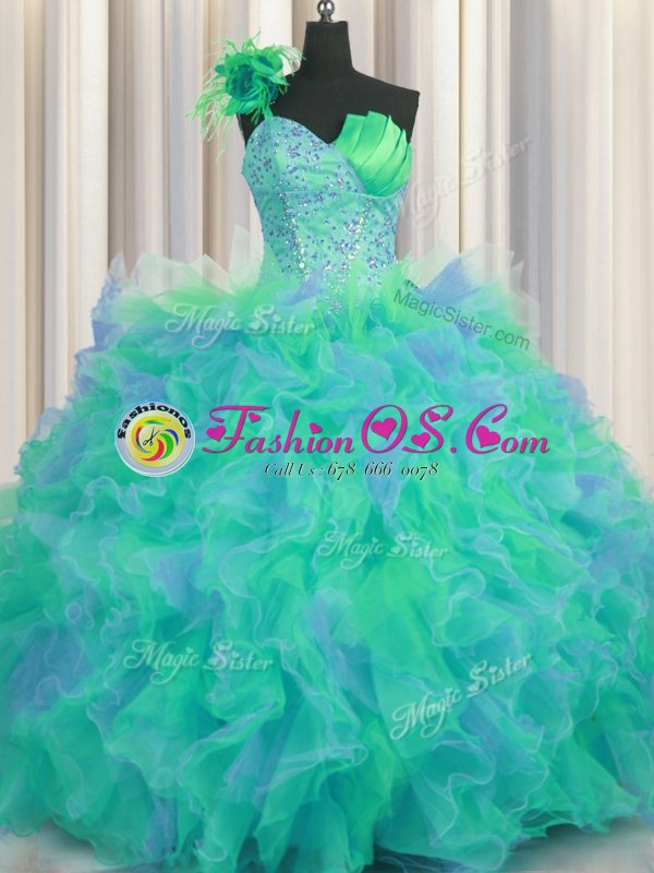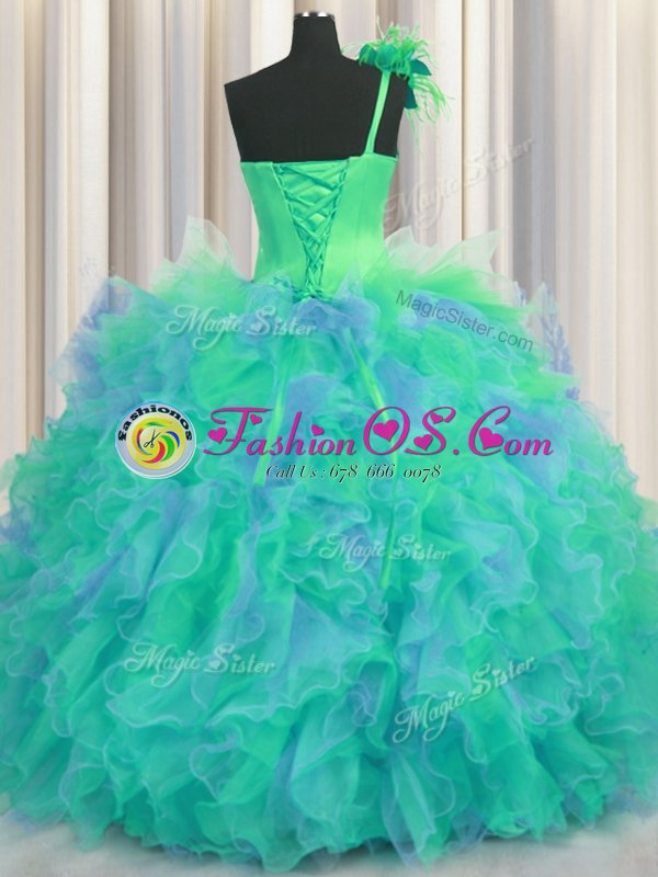 Custom Fit Handcrafted Flower One Shoulder Sleeveless Tulle Quinceanera Gowns Beading and Ruffles and Hand Made Flower Lace Up
