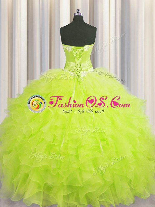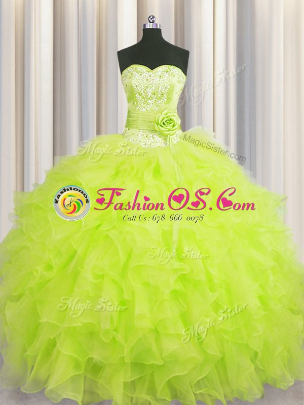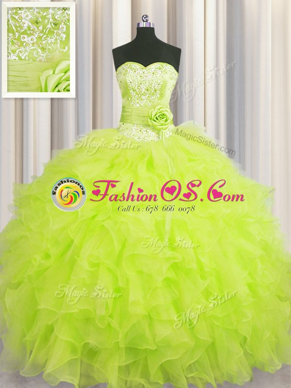 Handcrafted Flower Floor Length Yellow Green Sweet 16 Dresses Sweetheart Sleeveless Lace Up