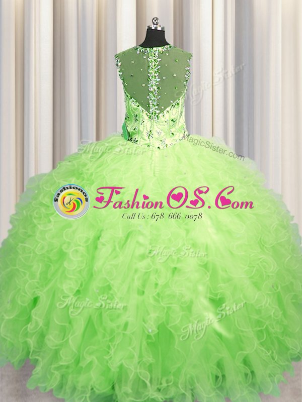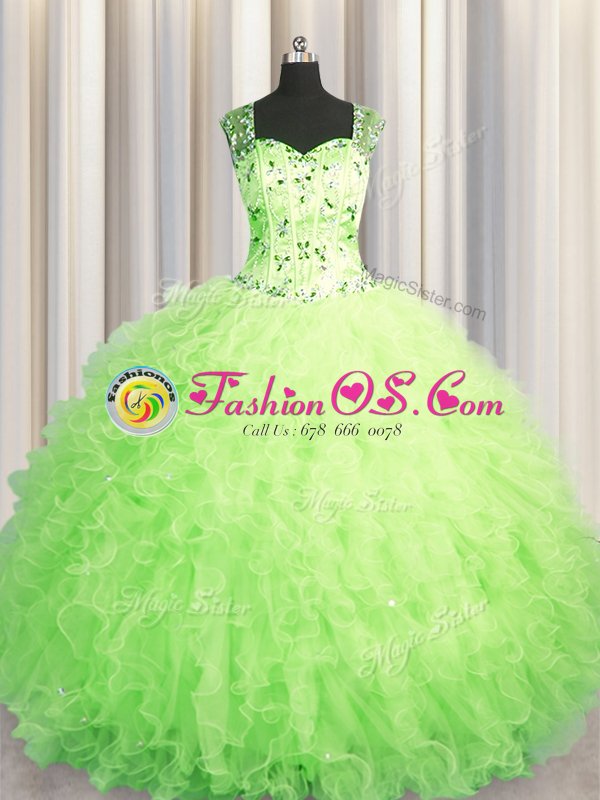 See Through Zipper Up Green Straps Zipper Beading and Ruffles Sweet 16 Dresses Sleeveless