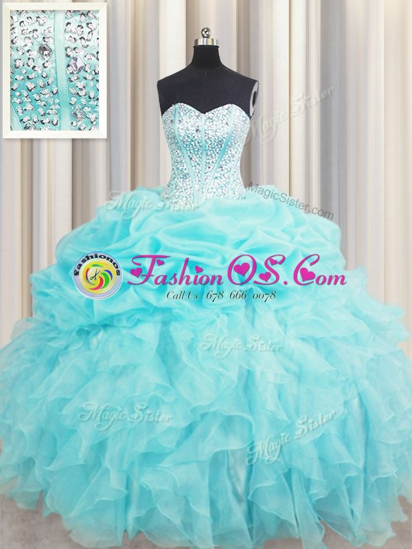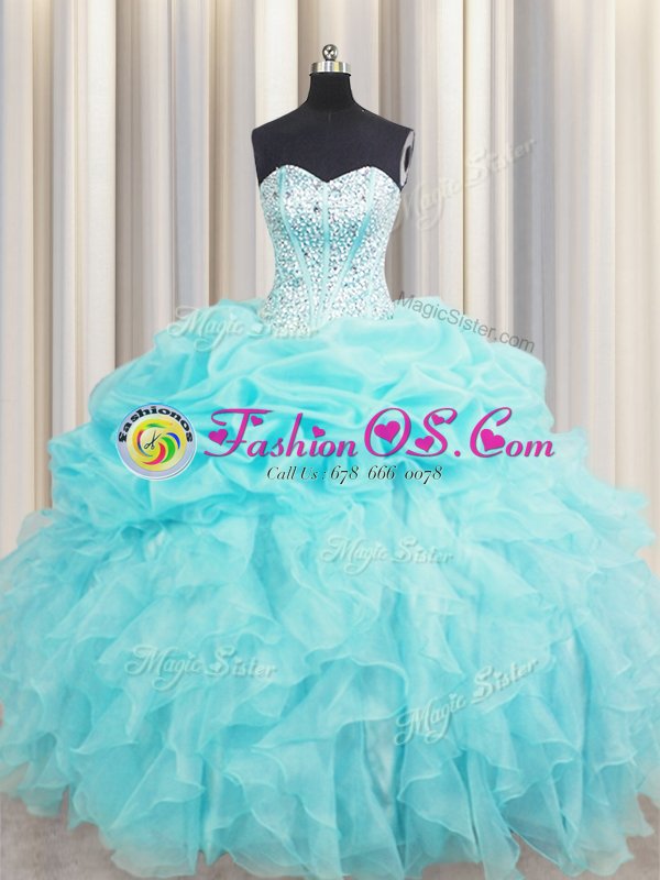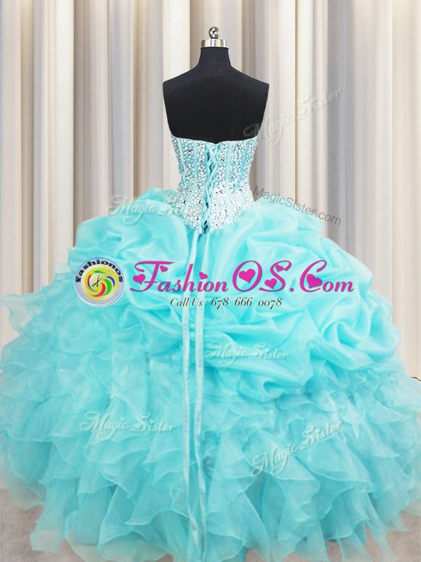 Visible Boning Organza Sweetheart Sleeveless Lace Up Beading and Ruffles and Pick Ups Quinceanera Dresses in Aqua Blue