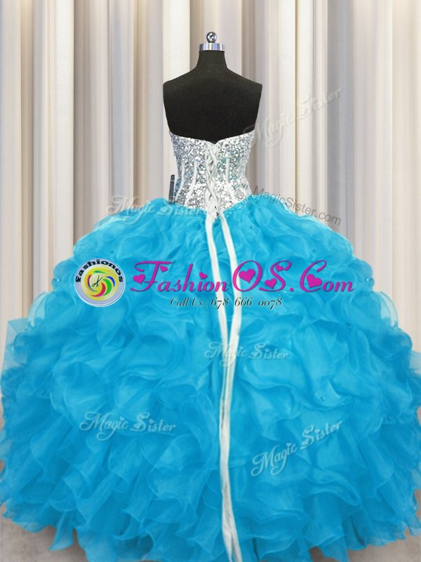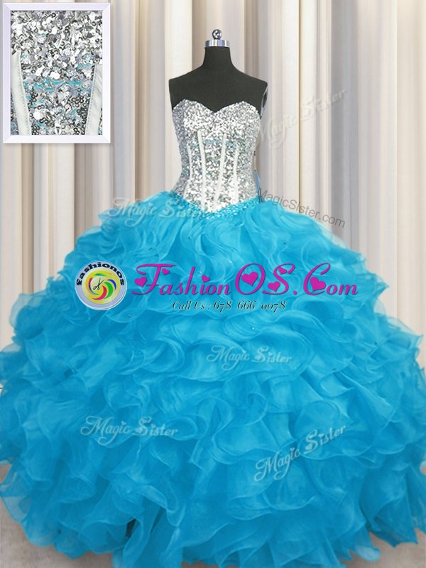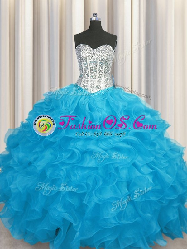 Top Selling Sweetheart Long Sleeves 15th Birthday Dress Floor Length Beading and Ruffles Aqua Blue Organza
