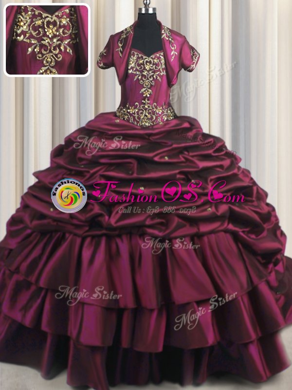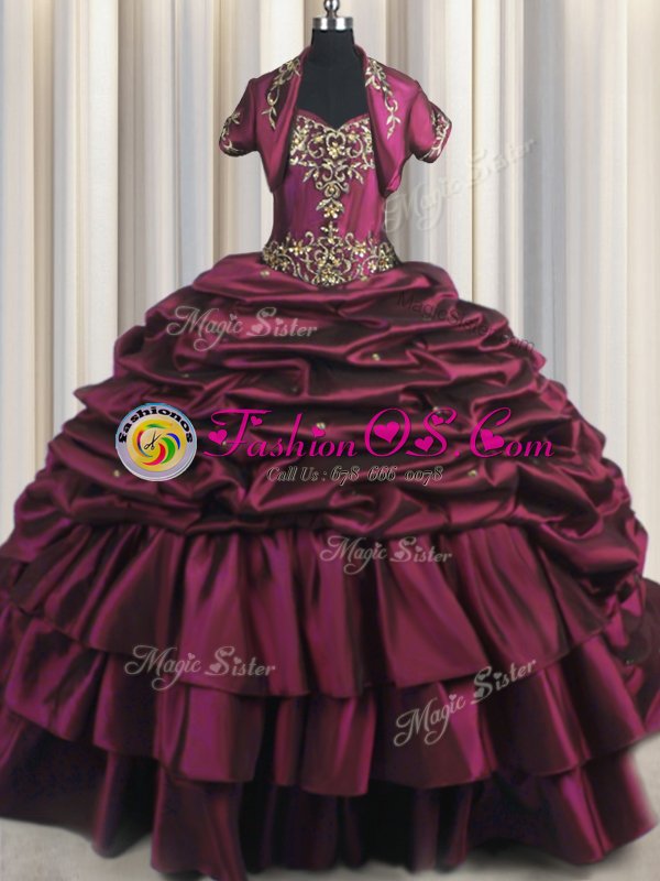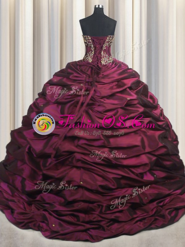 Pick Ups Burgundy Sleeveless Taffeta Brush Train Lace Up Sweet 16 Quinceanera Dress for Military Ball and Sweet 16 and Quinceanera
