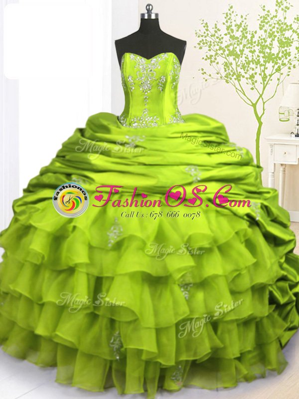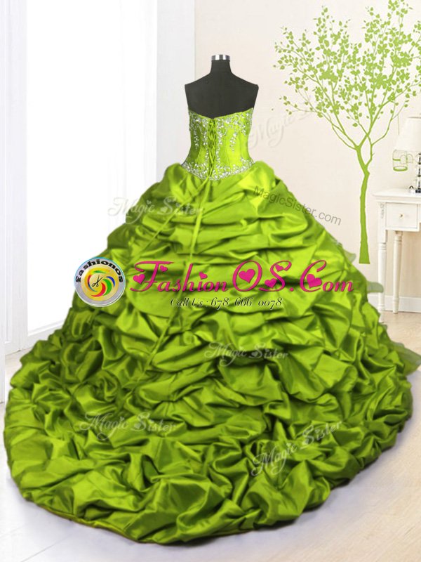 Pick Ups Ruffled With Train Olive Green Sweet 16 Dresses Strapless Sleeveless Brush Train Lace Up