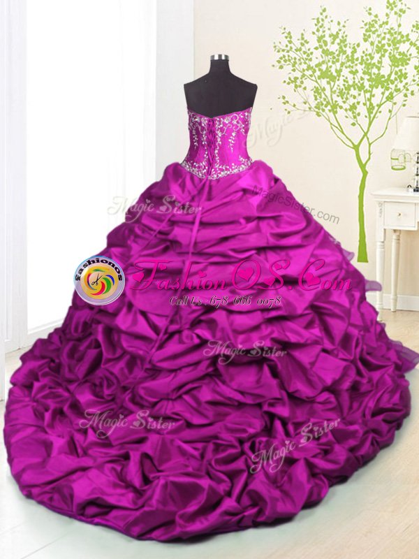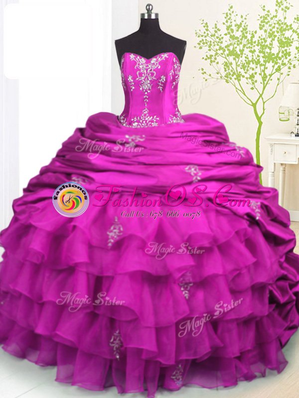 High End Sleeveless Organza and Taffeta With Brush Train Lace Up 15 Quinceanera Dress in Fuchsia for with Beading and Appliques and Ruffled Layers and Pick Ups