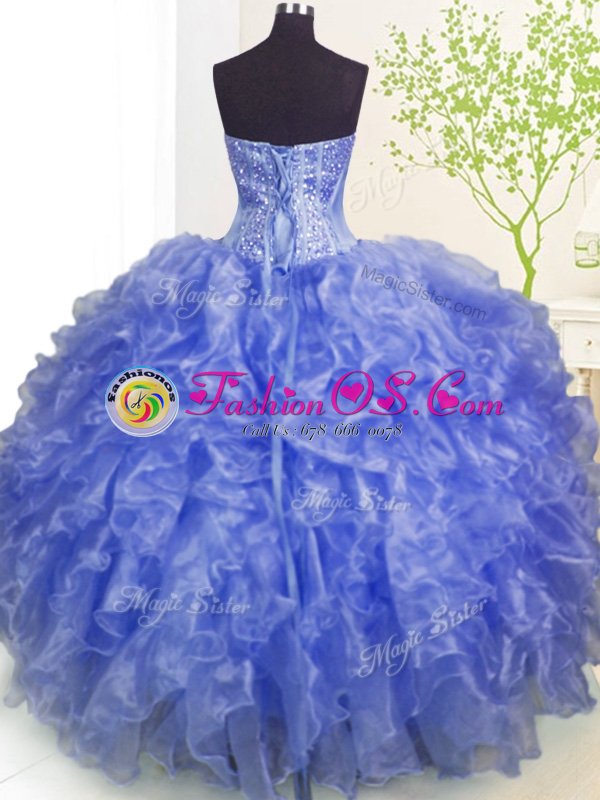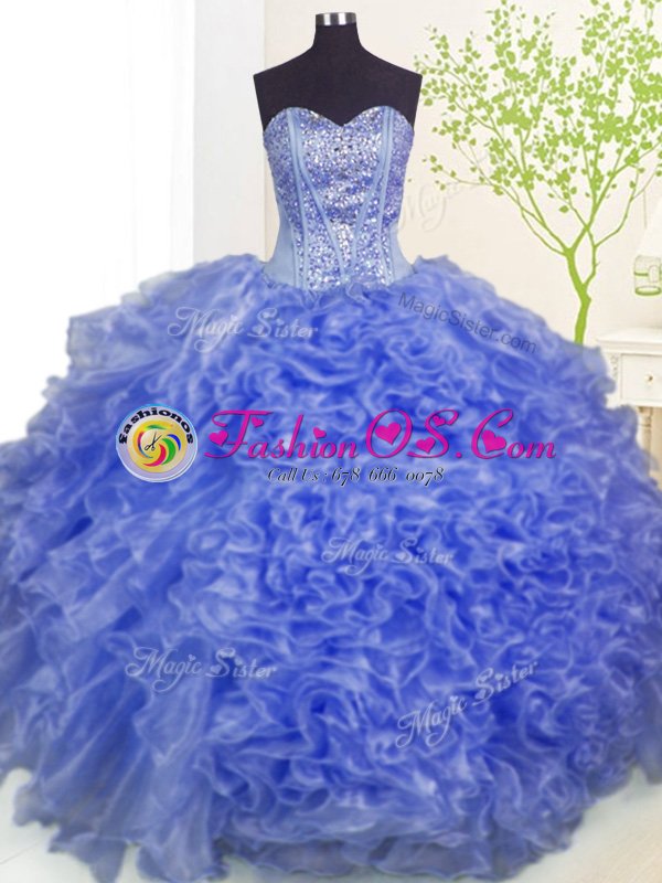 Fabulous Sweetheart Sleeveless Sweet 16 Dress Floor Length Beading and Ruffles and Pick Ups Blue Organza