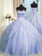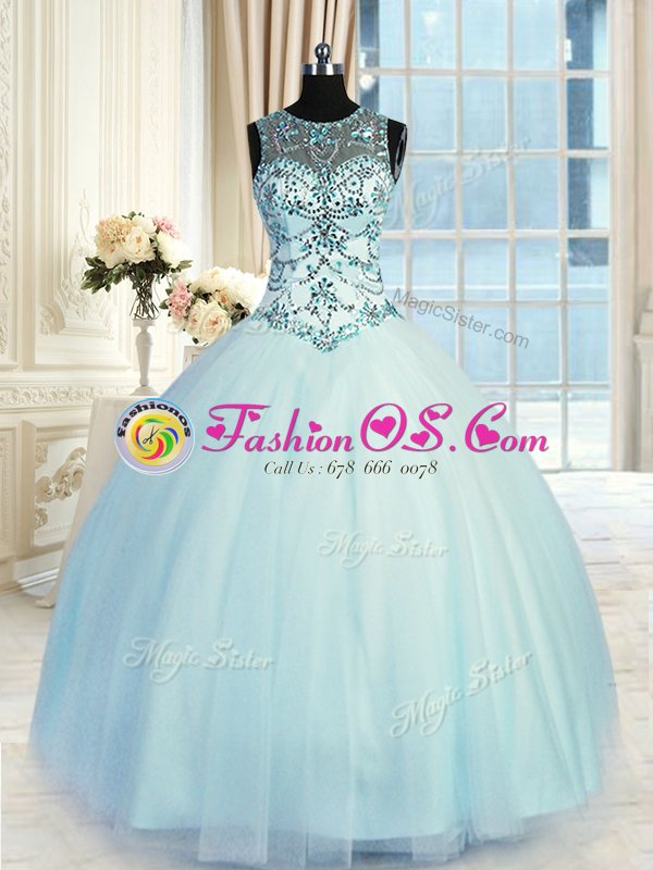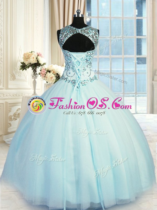 Scoop Light Blue Ball Gowns Beading Ball Gown Prom Dress Lace Up Tulle Sleeveless Floor Length