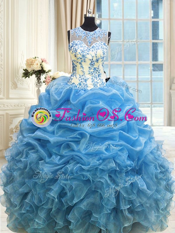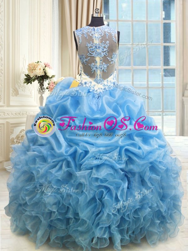 Scoop Floor Length Baby Blue Quinceanera Gown Organza Sleeveless Beading and Ruffles