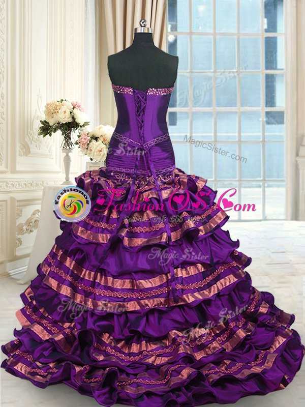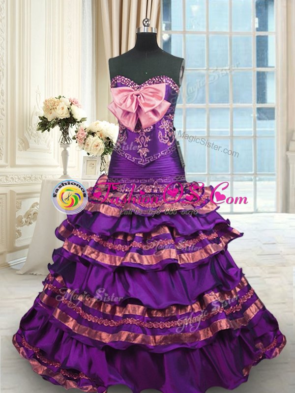 Purple Sleeveless Brush Train Appliques and Ruffled Layers and Bowknot Quinceanera Dresses