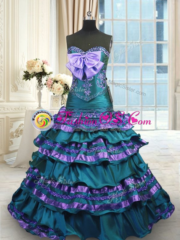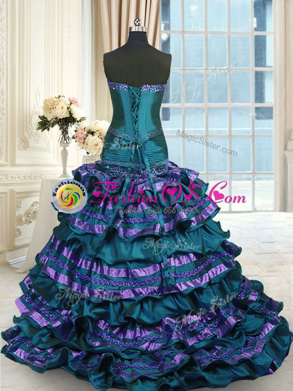 Captivating Ruffled Layers Sweep Train A-line 15th Birthday Dress Peacock Green Sweetheart Taffeta Sleeveless Lace Up