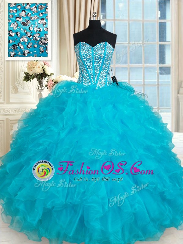 On Sale Aqua Blue Ball Gowns Sweetheart Sleeveless Organza Floor Length Lace Up Beading and Ruffles Ball Gown Prom Dress
