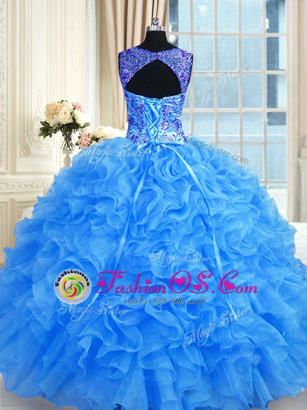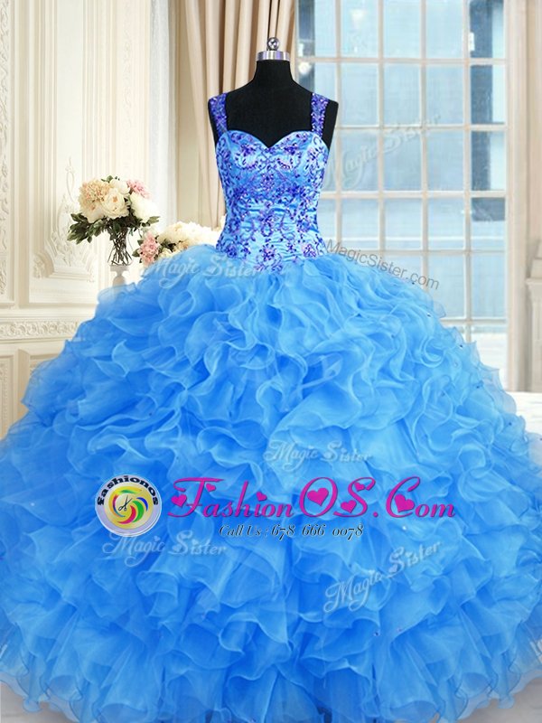 High Quality Baby Blue Lace Up Sweetheart Beading and Embroidery and Ruffles Quinceanera Dresses Organza Sleeveless