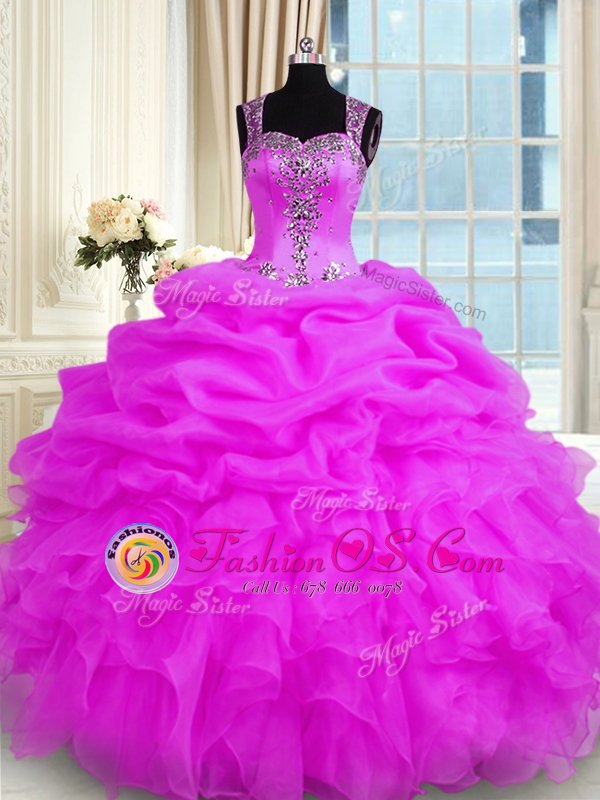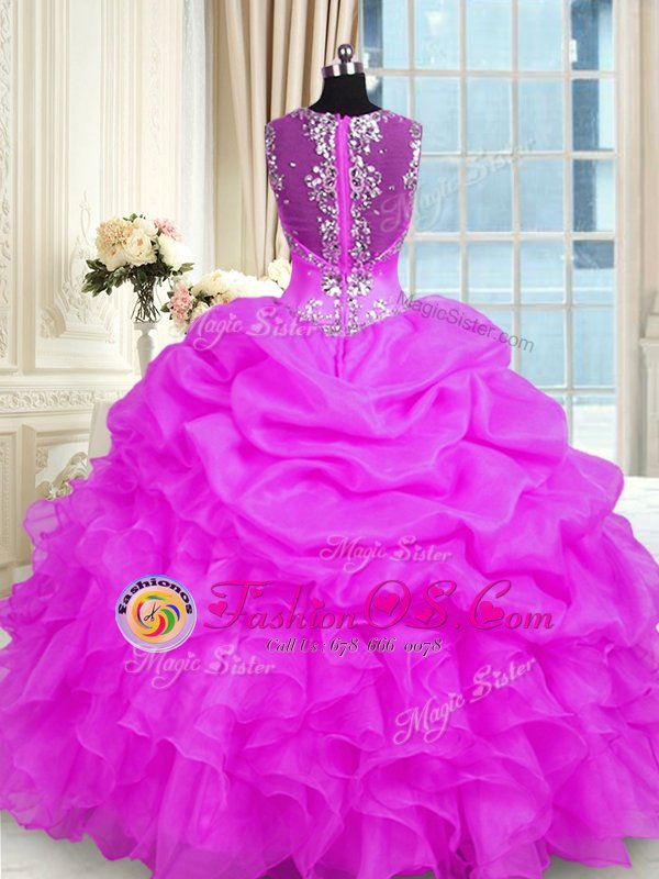 Captivating Fuchsia Sleeveless Beading and Ruffled Layers Floor Length Quinceanera Gown