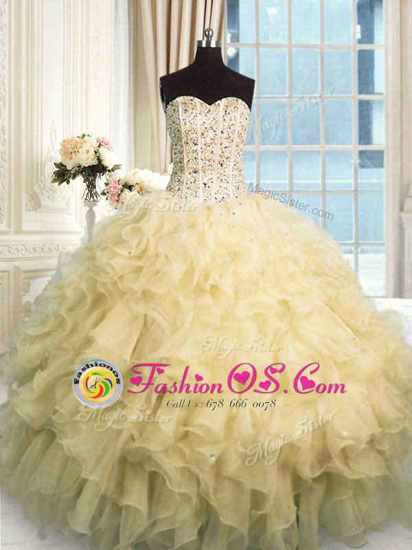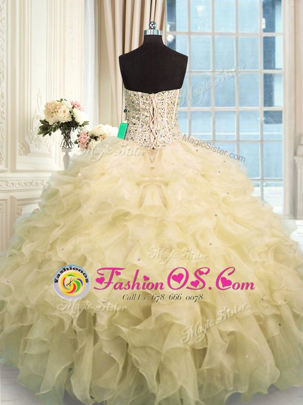 Flare Champagne Ball Gowns Beading and Ruffles Sweet 16 Quinceanera Dress Lace Up Organza Sleeveless Floor Length