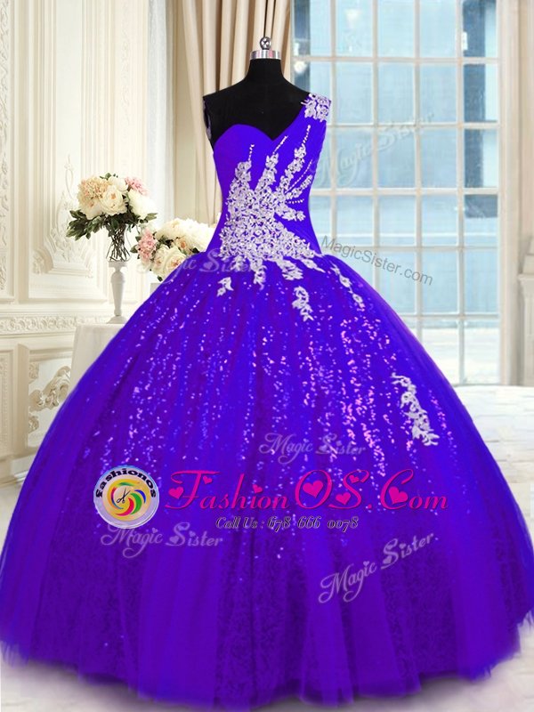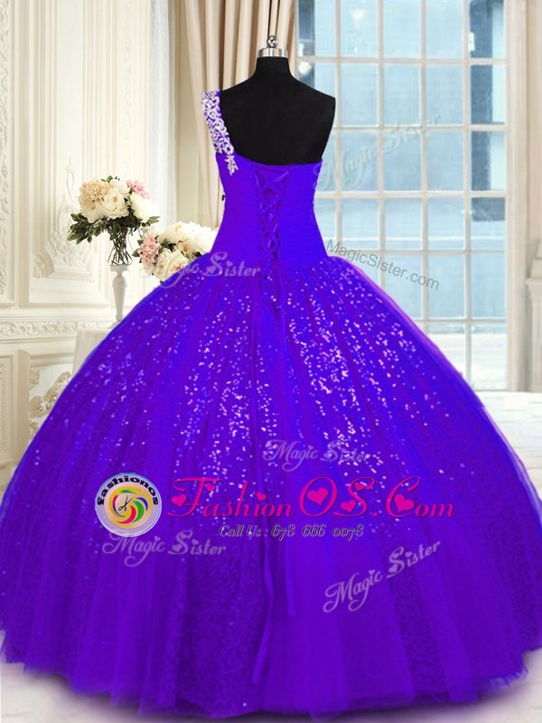 Perfect One Shoulder Purple Ball Gowns Appliques Quinceanera Gowns Lace Up Tulle and Sequined Sleeveless Floor Length