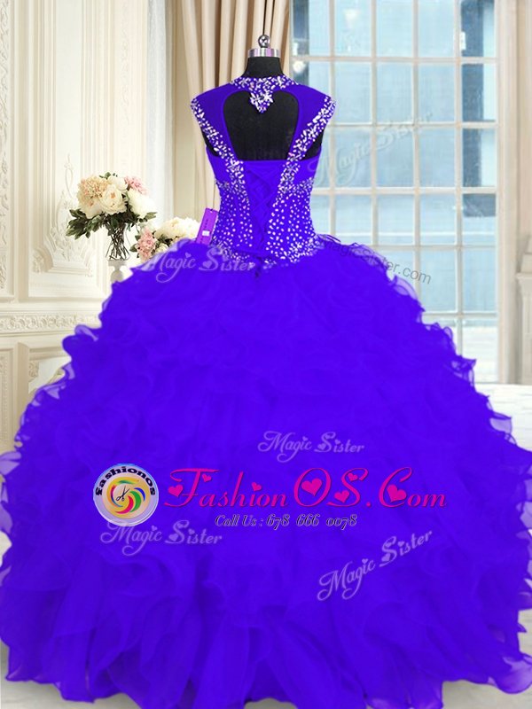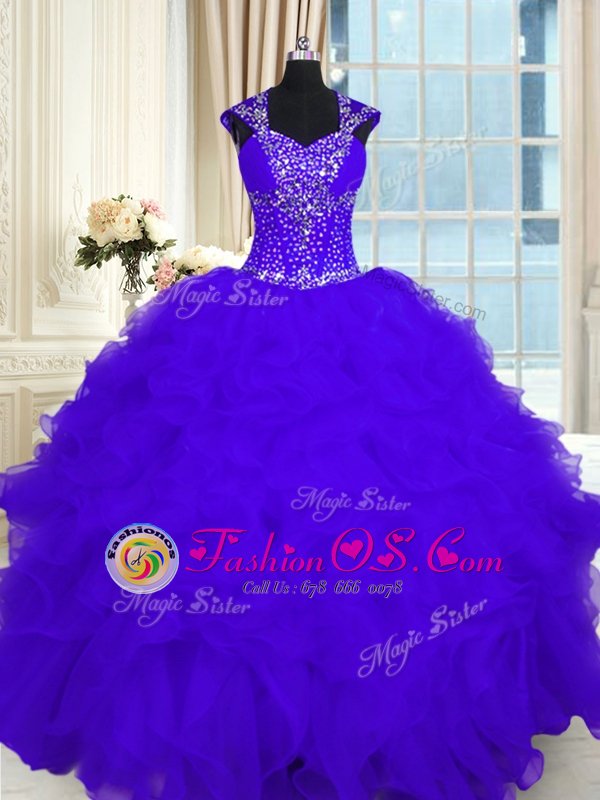 Cap Sleeves Organza Floor Length Lace Up Quince Ball Gowns in Purple for with Beading and Ruffles