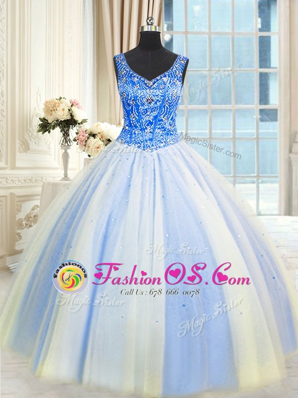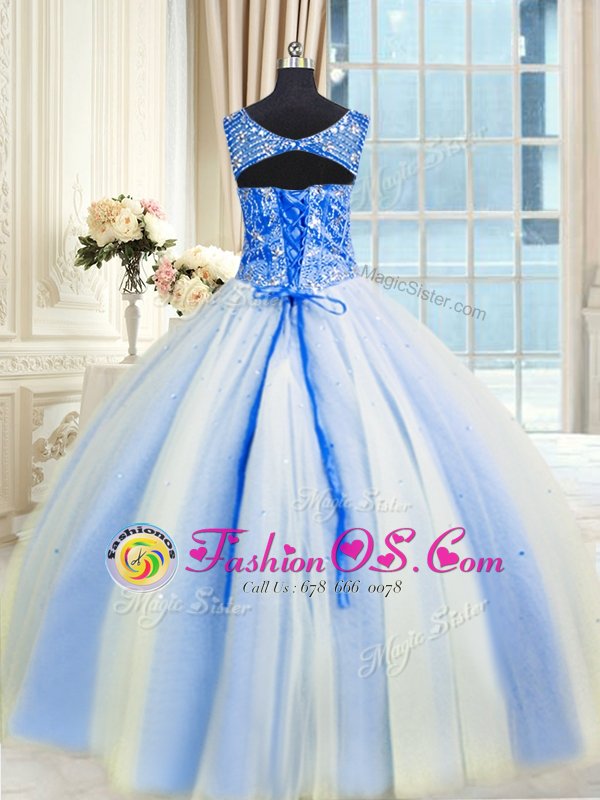 Low Price Sleeveless Tulle Floor Length Lace Up Quinceanera Gown in Blue And White for with Beading and Sequins