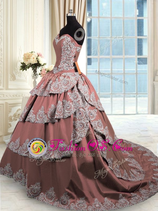 Brown Lace Up Quinceanera Dresses Beading and Appliques and Ruffled Layers Sleeveless With Train Court Train