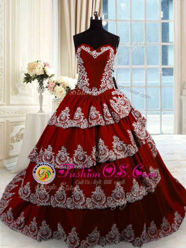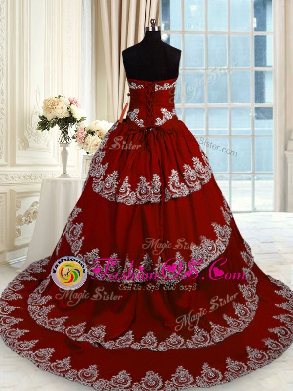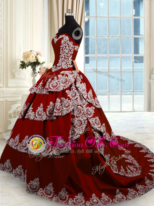 Ruffled Wine Red Sleeveless Taffeta Court Train Lace Up Quinceanera Gowns for Military Ball and Sweet 16 and Quinceanera