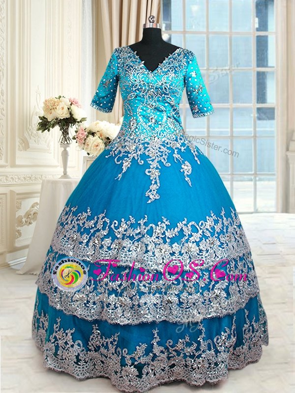 Floor Length Teal Sweet 16 Dresses Tulle Half Sleeves Beading and Lace and Appliques and Ruffled Layers