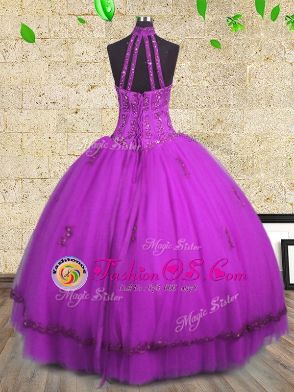 Halter Top Floor Length Lace Up Quinceanera Dress Purple and In for Military Ball and Sweet 16 and Quinceanera with Beading