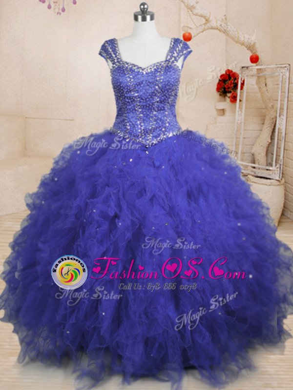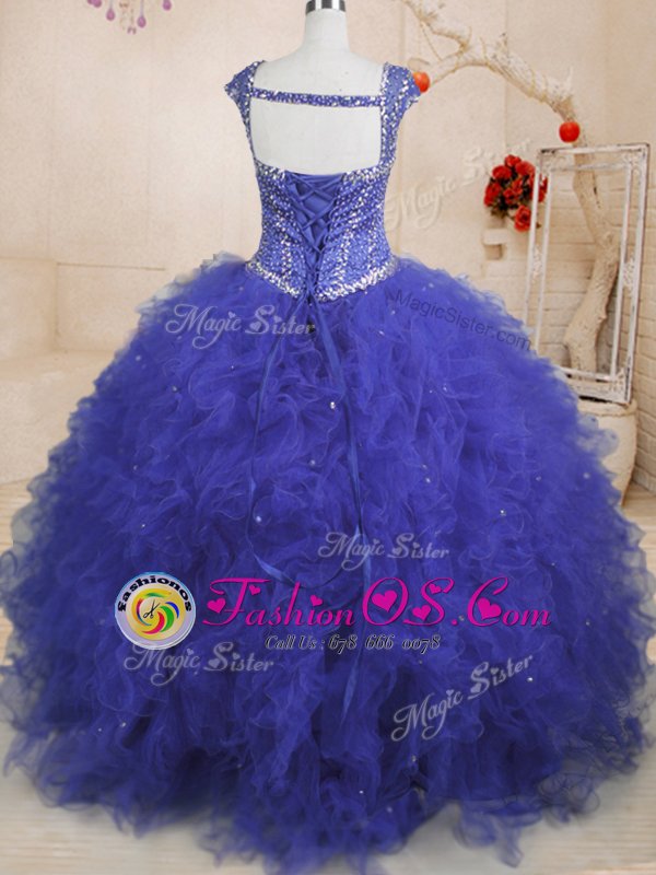 Delicate Royal Blue Ball Gowns Square Cap Sleeves Tulle Floor Length Lace Up Beading and Ruffles and Sequins Sweet 16 Quinceanera Dress